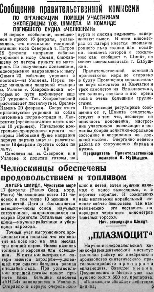 В последнем сообщении, помещенном в прессе 18 февраля, указывалось, что правительственной комиссией принимаются меры по отправке в бухту Провидения дополнительно двух самолетов с Камчатки и трех самолетов из Владивостока.