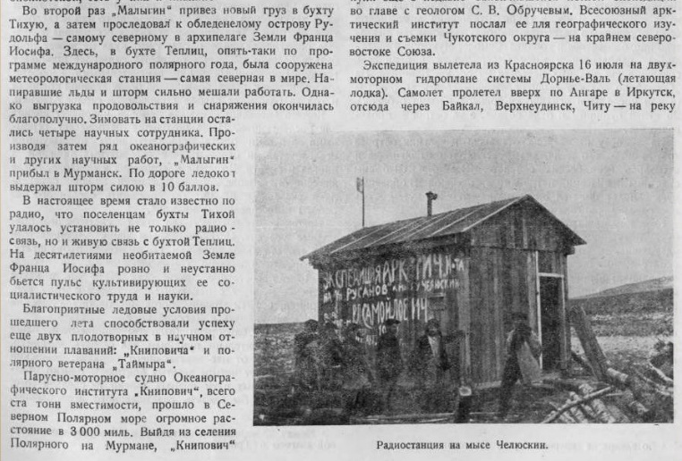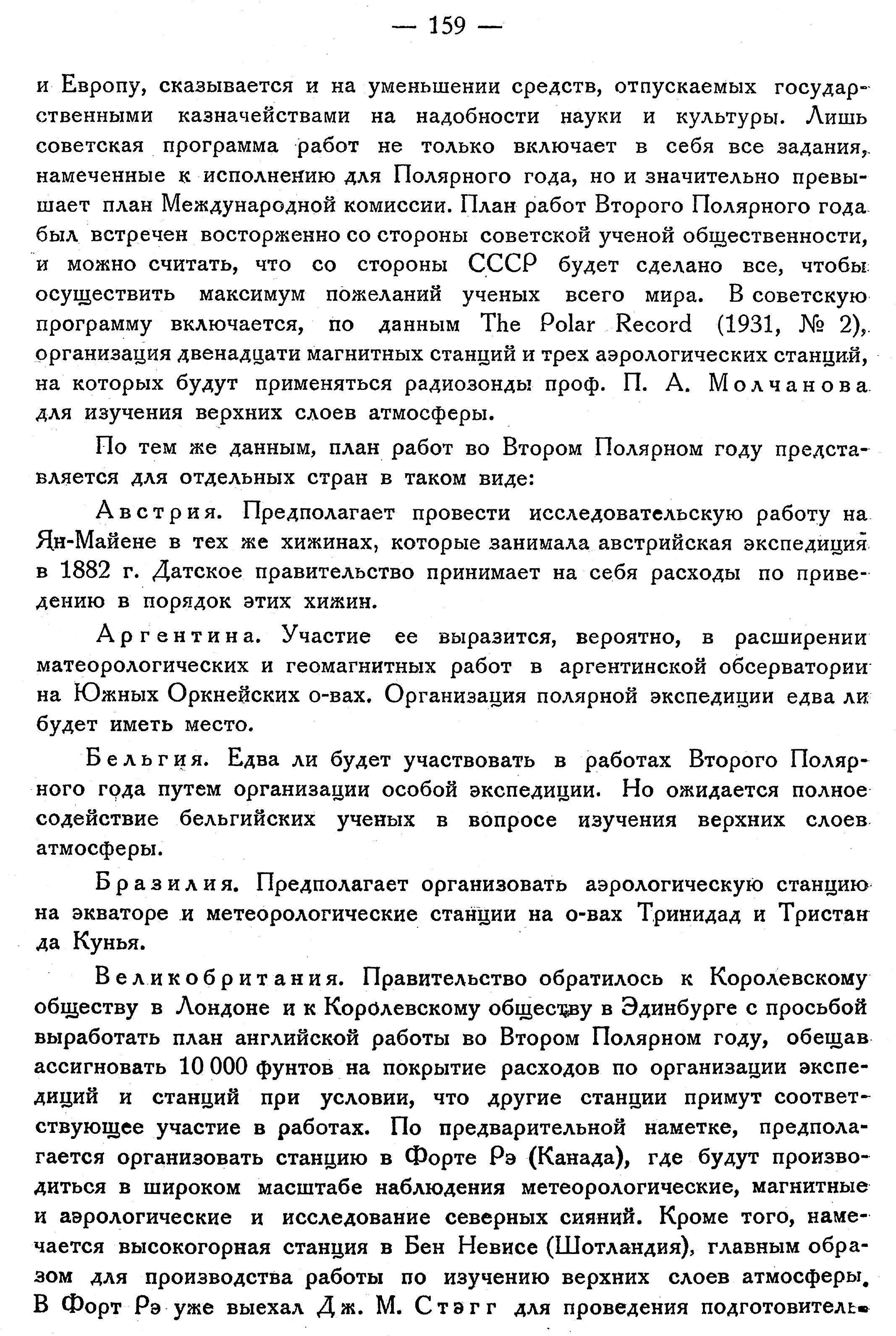 и Европу, сказывается и на уменьшении средств, отпускаемых государственными казначействами на надобности науки и культуры. Лишь советская программа работ не только включает в себя все задания, намеченные к исполнению для Полярного года, но и значительно превышает план Международной комиссии. План работ Второго Полярного года был встречен восторженно со стороны советской ученой общественности, и можно считать, что со стороны СССР будет сделано все, чтобы: осуществить максимум пожеланий ученых всего мира. В советскую программу включается, по данным The Polar Record (1931, № 2), организация двенадцати магнитных станций и трех аэрологических станций, на которых будут применяться радиозонды проф. П. А. Молчанова, для изучения верхних слоев атмосферы.