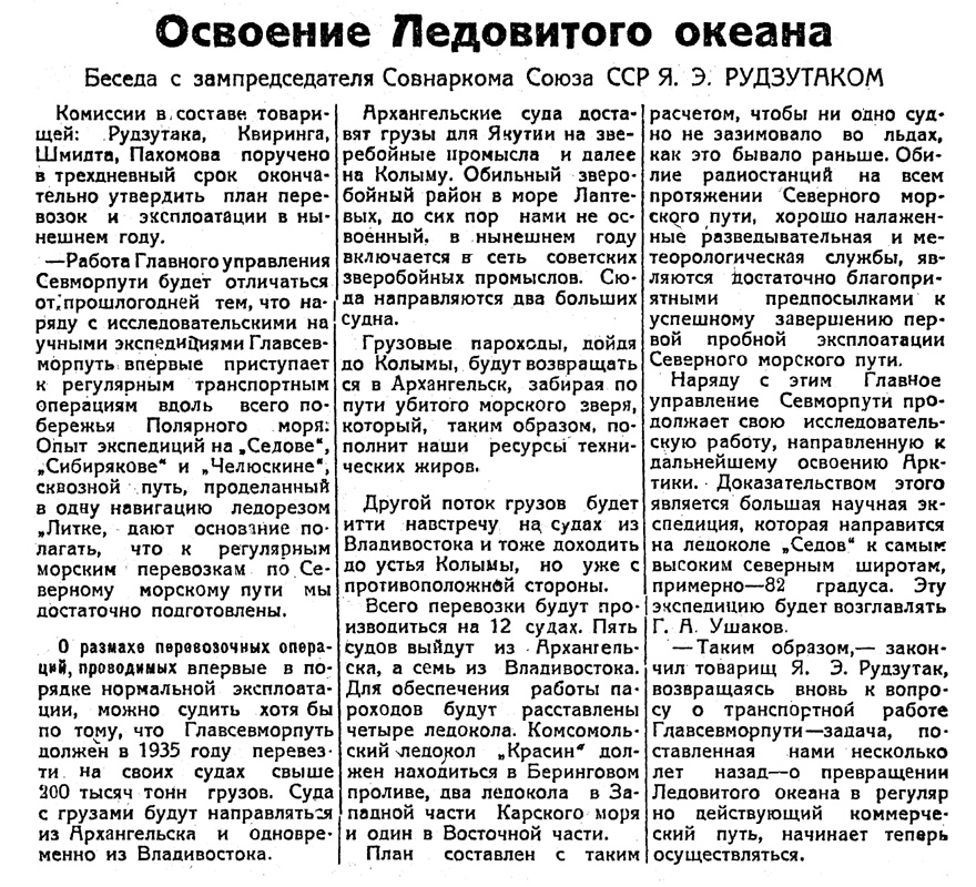 О размахе перевозочных операций, проводимых впервые в порядке нормальной эксплуатации, можно судить хотя бы по тому, что Главсевморпуть должен в 1935 году перевезти на своих судах свыше 200 тысяч тонн грузов. Суда с грузами будут направляться из Архангельска и одновременно из Владивостока.