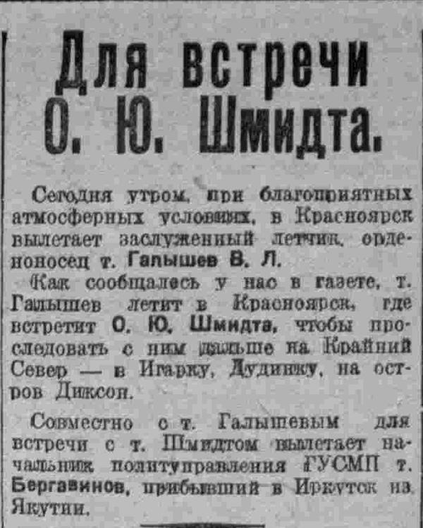 Сегодня утром, при благоприятных атмосферных условиях, в Красноярск вылетает заслуженный летчик, орденоносец т. Галышев В. Л. Как сообщалось у нас в газете, т. Галышев летит в Красноярск, где встретит О. Ю. Шмидта, чтобы проследовать с ним дальше на Крайний Север — в Игарку, Дудинку, на остров Диксон.