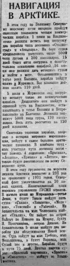 Предварительное решение о проведении первой навигации по всему Северному морскому пути на грузовых судах было принято Главсевморпути, а в апреле 1935 г. оно приобрело силу правительственного постановления, в котором отмечались значительные успехи полярников в ледовых плаваниях и предлагалось Главсевморпути «приступить к перевозке грузов на коммерческих судах по Северному морскому пути от Мурманска до Владивостока» 1.