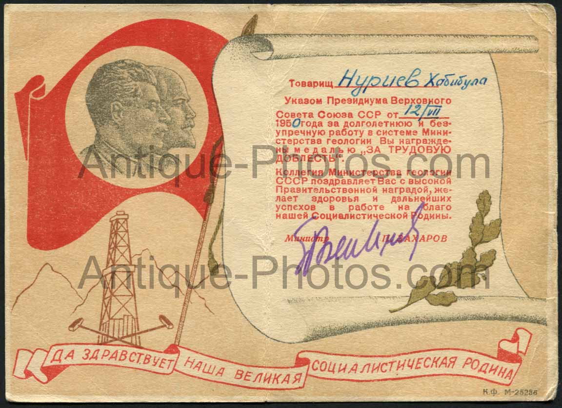 3. Необычное удостоверение о награждении сотрудника министерства геологии Хабибулы Нуриева медалью "За трудовую доблесть", датированное 12 августа 1950 года.