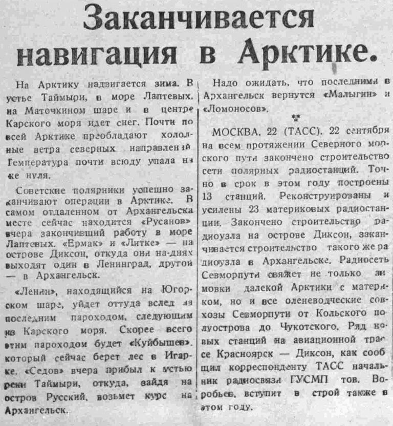 Советские полярники успешно заканчивают операции в Арктике. В самом отдаленном от Архангельска месте сейчас находится «Русанов» вчера закончивший работу в море Лаптевых. «Ермак» и «Литке» — на острове Диксон, откуда они на-днях выходят один в Ленинград, другой — в Архангельск.