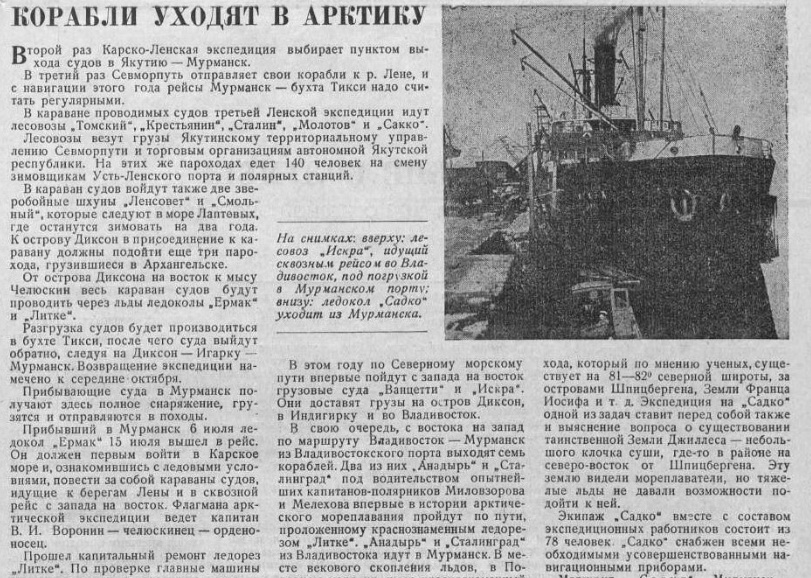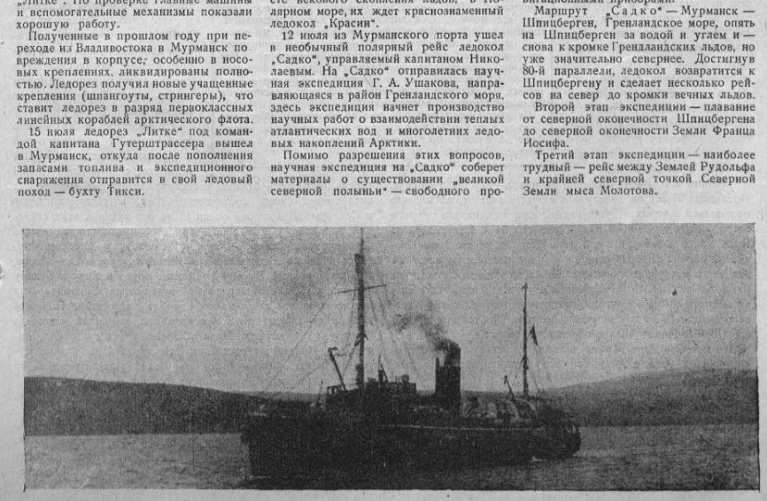 Развитие грузовых операций на Севере требует дальнейшего исследования Ледовитого океана. Для этой цели отправляется специальная научная экспедиция на л/п „Садко" под начальством Г. А. Ушакова.