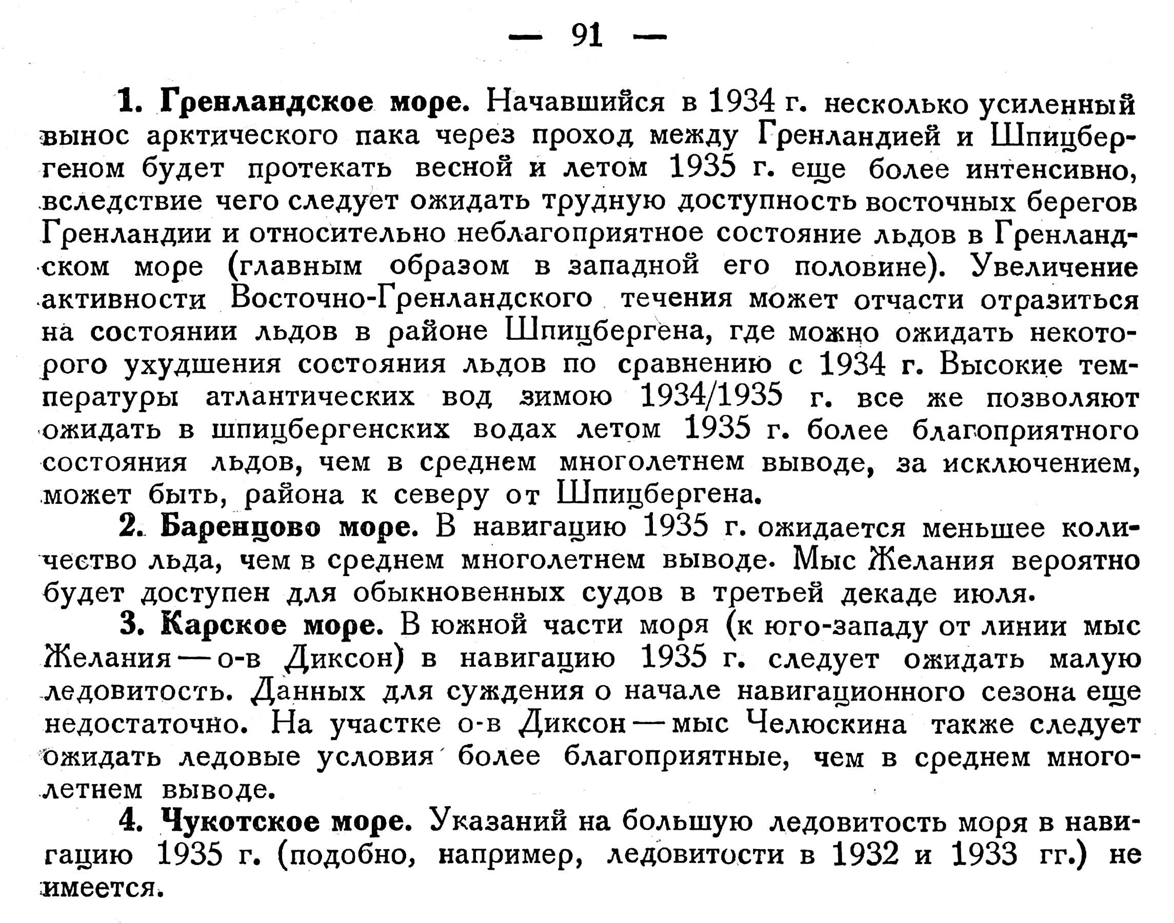 2. Баренцово море. В навигацию 1935 г. ожидается меньшее количество льда, чем в среднем многолетнем выводе. Мыс Желания вероятно будет доступен для обыкновенных судов в третьей декаде июля.
