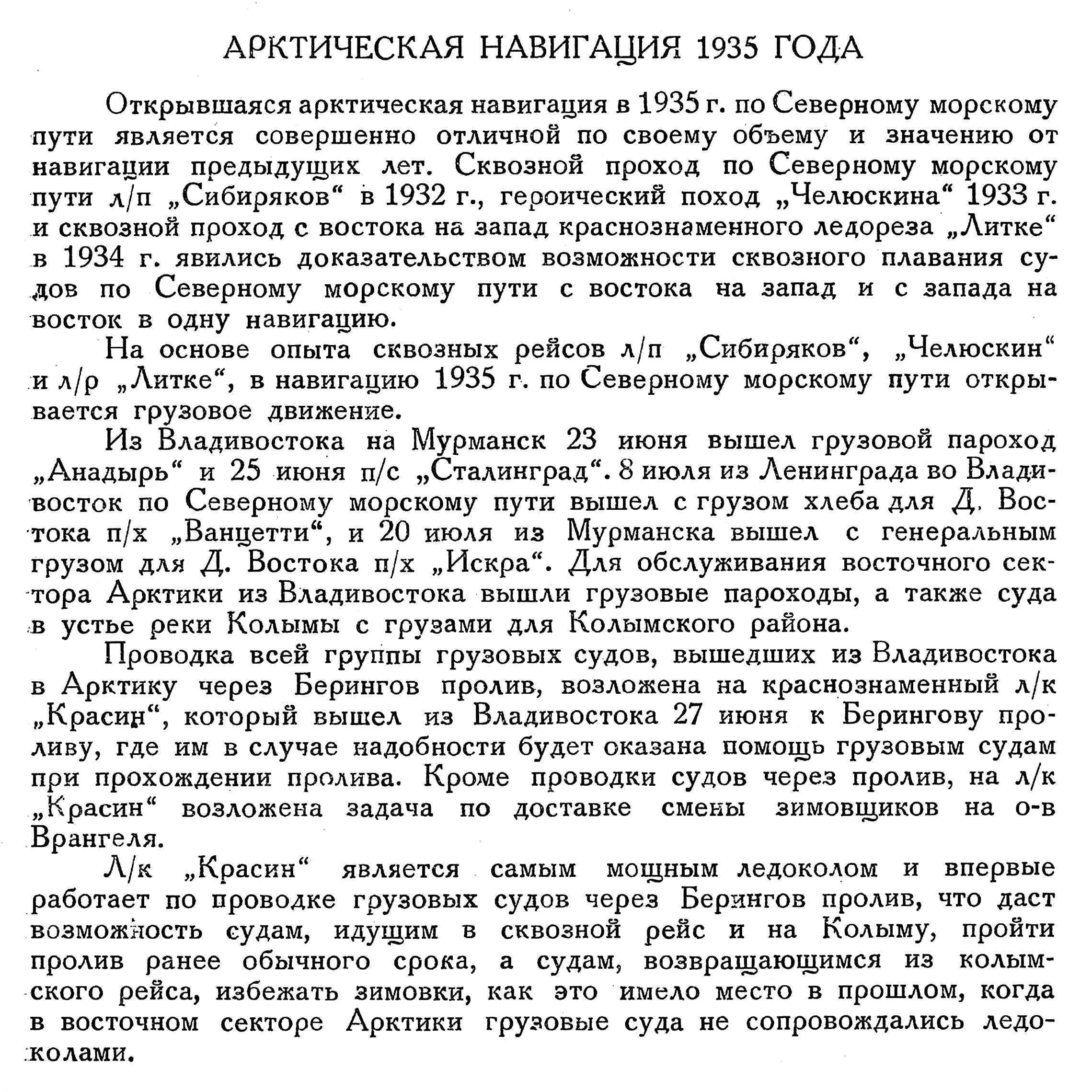 Открывшаяся арктическая навигация в 1935 г. по Северному морскому пути является совершенно отличной по своему объему и значению от навигации предыдущих лет. Сквозной проход по Северному морскому пути л/п „Сибиряков" в 1932 г., героический поход „Челюскина" 1933 г. и сквозной проход с востока на запад краснознаменного ледореза „Литке" в 1934 г. явились доказательством возможности сквозного плавания судов по Северному морскому пути с востока на запад и с запада на восток в одну навигацию.