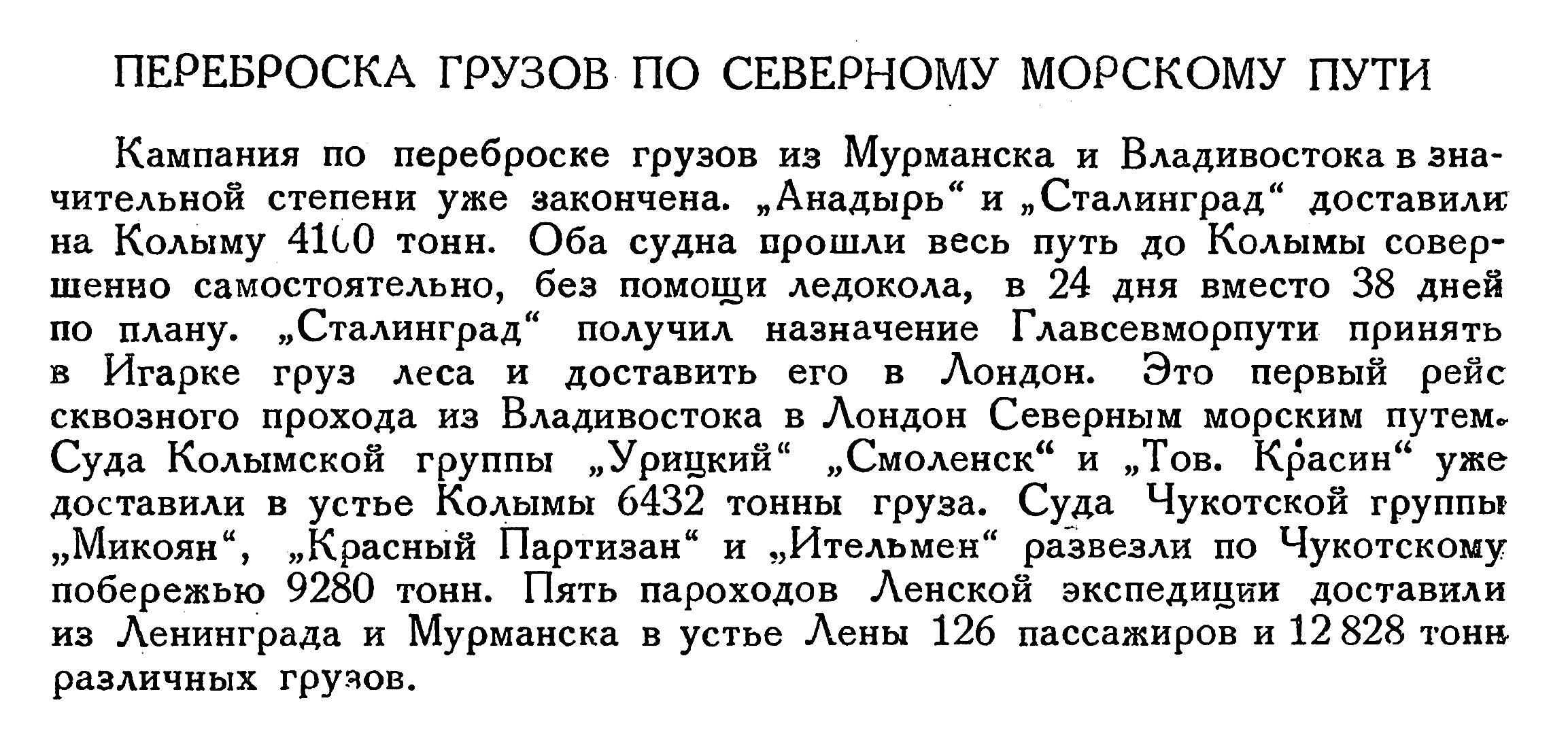 Впервые в истории мореплавания проведены важнейшие сквозные рейсы на обычных грузовых пароходах "Анадырь" и "Сталинград" из Владивостока на Мурманск и на пароходах "Ванцетти" и "Искра" из Мурманска во Владивосток.