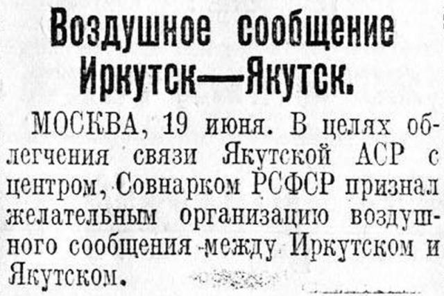 Открыты новые авиолинии Нижне-Удинск — Бирюса — 150 километров, Чита — прииск Ципикан — 350 километров, Чита — Хапчеранга — 360 километров. Общее протяжение линий по Восточносибирскому краю достигает 8203 километра.