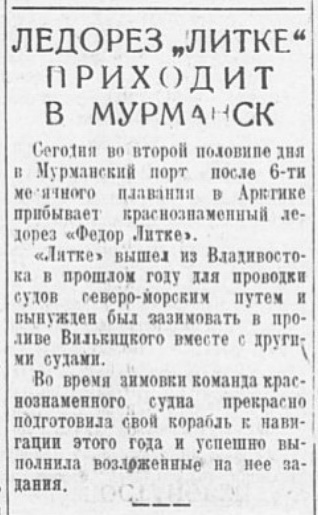 Еще раньше к каравану «Ф. Литке», который «Ермак» должен был выводить первым, направился бот «Мурманец» для разведки путей подхода. 16 июля, раньше других судов, бот достиг пролива Вилькицкого. Но узкая полынья в подвижных льдах закрылась за ботом, и капитан решил повернуть назад. Если бы «Ермак» не запоздал, он мог бы воспользоваться этой полыньей и уже в середине июля вывести караван «Ф. Литке» на чистую воду.