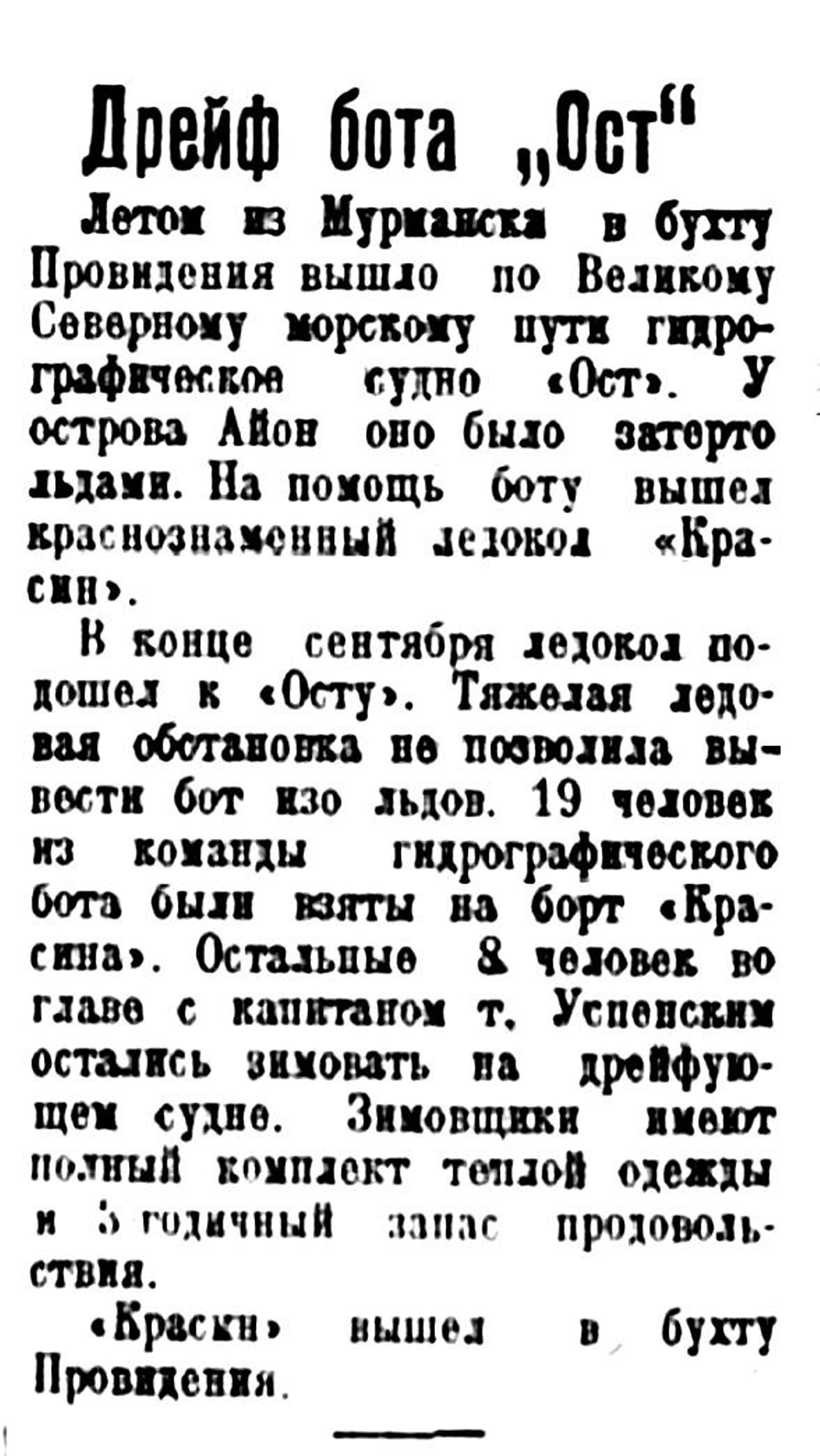 В конце сентября ледокол подошел к «Осту». Тяжелая ледовая обстановка не позволила вывести бот изо льдов. 19 человек из команды гидрографического бота были взяты на борт «Красина». Остальные 8 человек во главе с капитаном т. Успенским остались зимовать на дрейфующем судне. Зимовщики имеют полный комплект теплой одежды и 3 годичный запас продовольствия.