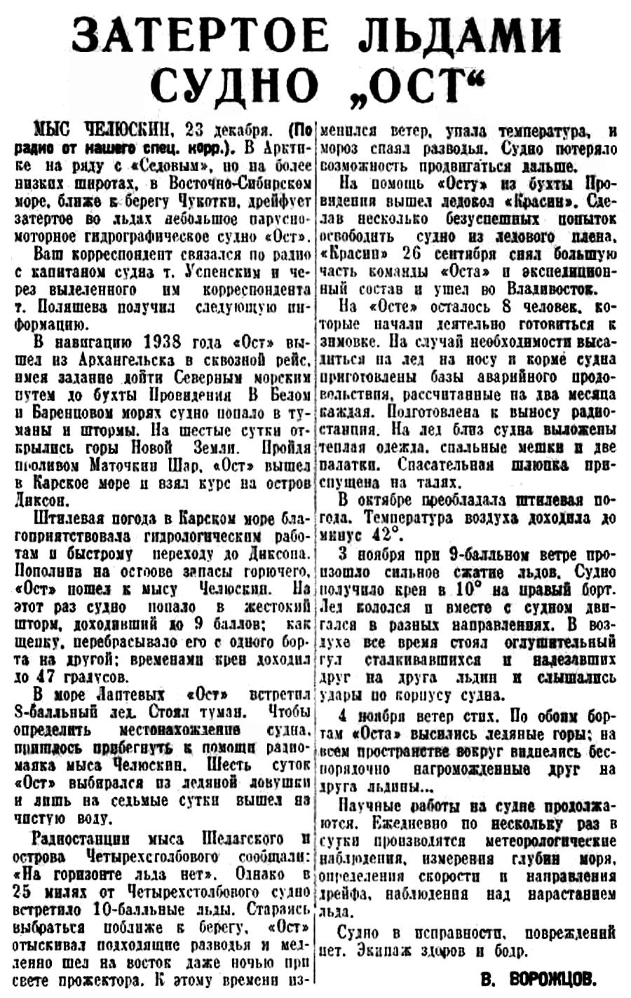 МЫС ЧЕЛЮСКИН, 23 декабря. (По радио от нашего спец. корр.). В Арктике на ряду с «Седовым», но на более низких широтах, в Восточно-Сибирском море, ближе к берегу Чукотки, дрейфует затертое во льдах небольшое парусномоторное гидрографическое судно «Ост».