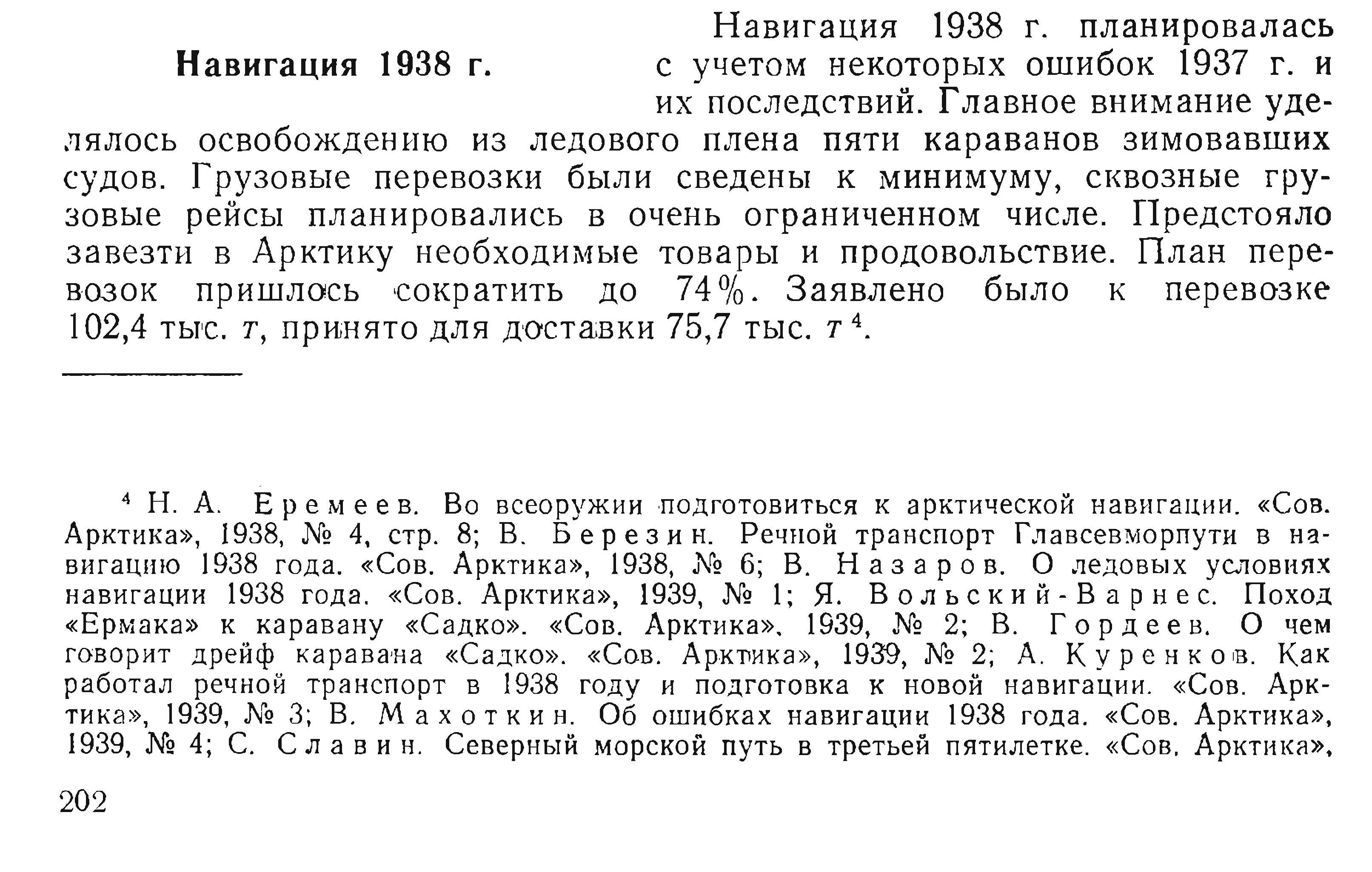{4} Н. А. Еремеев. Во всеоружии подготовиться к арктической навигации. «Сов. Арктика», 1938, № 4, стр. 8; В. Березин. Речной транспорт Главсевморпути в навигацию 1938 года. «Сов. Арктика», 1938, № 6; В. Назаров. О ледовых условиях навигации 1938 года. «Сов. Арктика», 1939, № 1; Я. Вольский-Варнес. Поход «Ермака» к каравану «Садко». «Сов. Арктика», 1939, № 2; В. Гордеев. О чем говорит дрейф каравана «Садко». «Сов. Арктика», 1939, № 2; А. Куренков. Как работал речной транспорт в 1938 году и подготовка к новой навигации. «Сов. Арктика», 1939, № 3; В. Махоткин. Об ошибках навигации 1938 года. «Сов. Арктика», 1939, № 4; С. Славин. Северный морской путь в третьей пятилетке. «Сов. Арктика»,