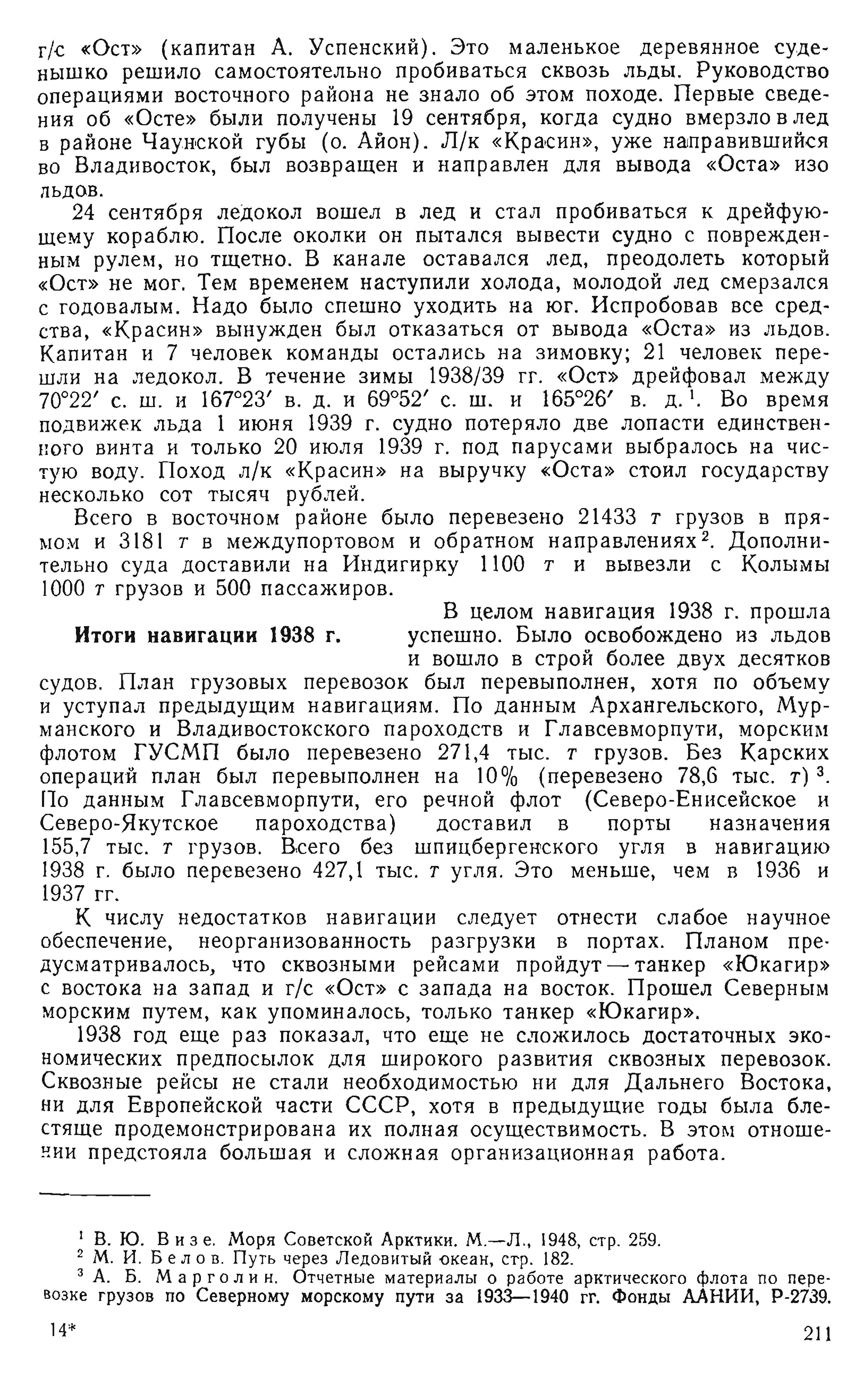 {3} А. Б. Марголин. Отчетные материалы о работе арктического флота по перевозке грузов по Северному морскому пути за 1933—1940 гг. Фонды ААНИИ, Р-2739.