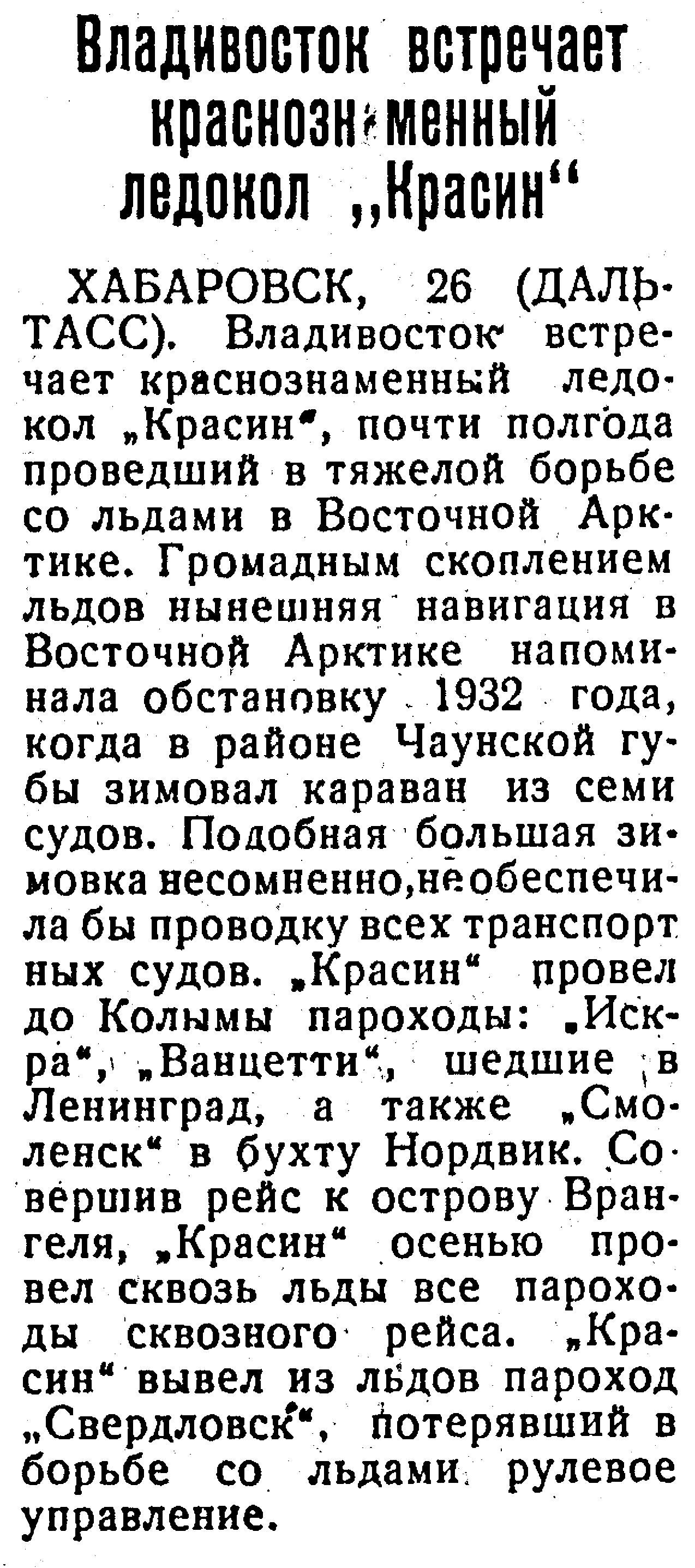 ХАБАРОВСК, 26 (ДАЛЬТАСС). Владивосток встречает краснознаменный ледокол "Красин", почти полгода проведший в тяжелой борьбе со льдами в Восточной Арктике. Громадным скоплением льдов нынешняя навигация в Восточной Арктике напоминала обстановку 1932 года, когда в районе Чаунской губы зимовал караван из семи судов. Подобная большая зимовка несомненно, не обеспечила бы проводку всех транспортных судов. "Красин" провел до Колымы пароходы: "Искра", "Ванцетти", шедшие в Ленинград, а также "Смоленск" в бухту Нордвик. Совершив рейс к острову Врангеля, "Красин" осенью провел сквозь льды все пароходы сквозного рейса. "Красин" вывел из льдов пароход "Свердловск", потерявший в борьбе со льдами рулевое управление.
