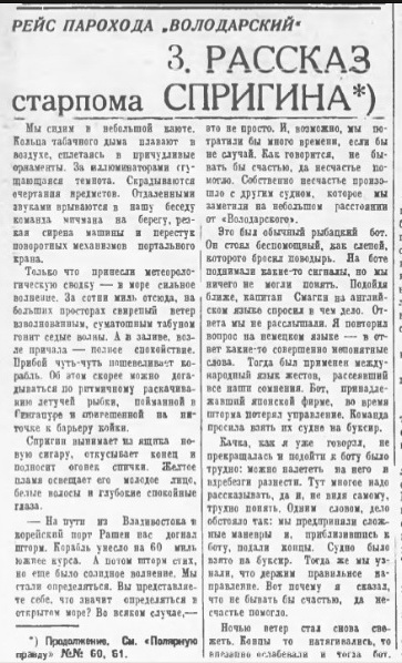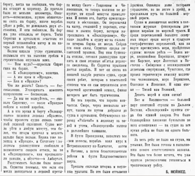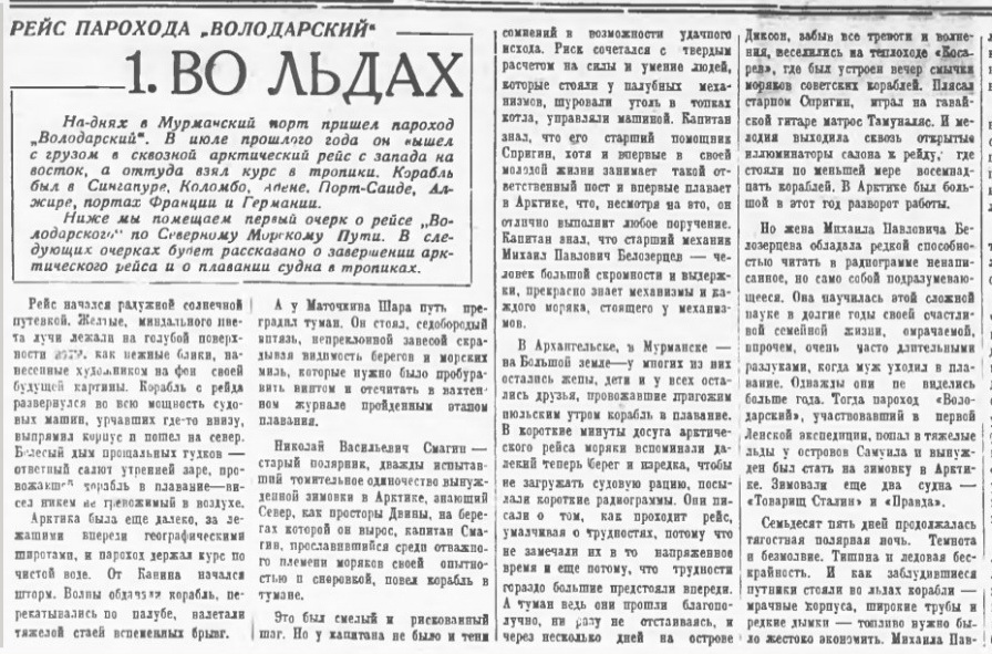 К Владивостоку подходят последние пароходы полярных экспедиций. В ближайшие дни ожидается прибытие трех пароходов: "Рабочий", "Правда" и "Крестьянин", ходивших с запада в Колыму и вынужденных вследствие тяжелых ледовых условий, вместо возвращения в Мурманск, итти во Владивосток. Четвертый из числа этих пароходов „Володарский" прибыл в Ногаево, где приступил к выгрузке доставленных им сквозным рейсом товаров.