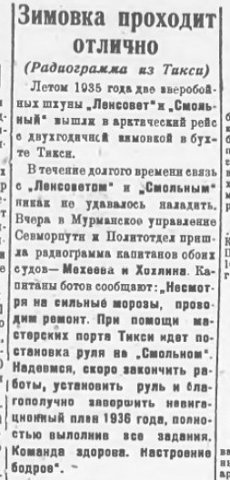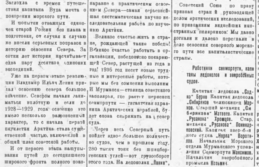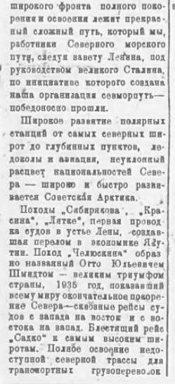 Победы арктической навигации 1936 года достигнуты стахановской работой наших моряков, летчиков, зимовщиков и политических работников. Все они, воодушевленные заботой партии, правительства и любимого вождя народов товарища Сталина, ведут упорную борьбу с при родными трудностями за безусловное выполнение сталинской директивы — освоить и развить Северный морской путь. Начиная с 1929 года для этой цели был организован ряд экспедиционных походов ("Седов", "Сибиряков", "Челюскин", "Литке" и другие), благодаря которым 1934 год мог стать годом широкой разведки для использования морей Арктики. 1935 год стал годом начала нормальной эксплоатации этих морей и 1936 год — есть год уверенного освоения и эксплоатации Северного морского пути.
