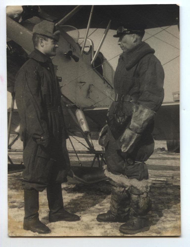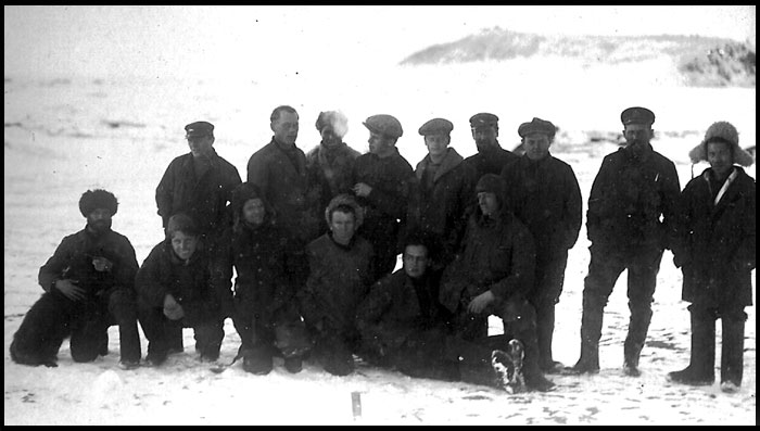 самый крайний слева (в "сидячем" ряду) - наверняка бортмеханик Леонид Петрович Демидов ("с чёрной бородой, и вид имеет рязанского мужика, а не лётчика" - С. В. Обручев, "На самолёте в Восточной Арктике").