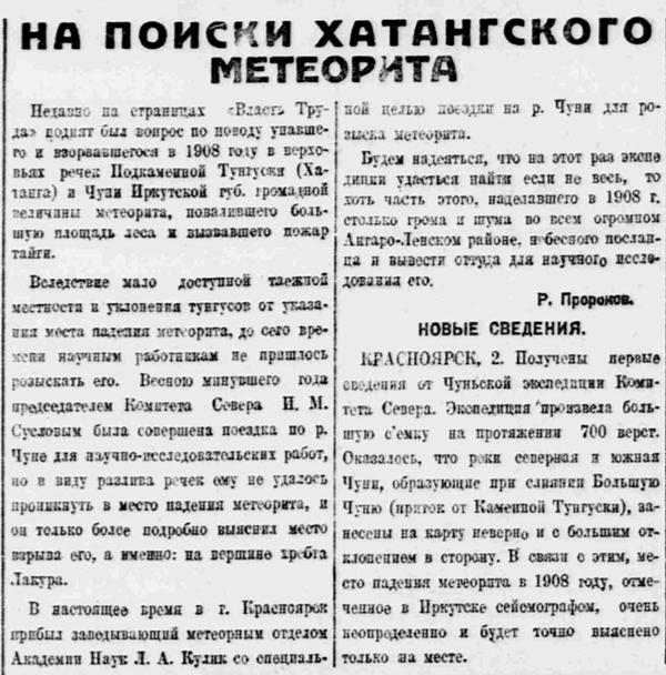 КРАСНОЯРСК, 2. Получены первые сведения от Чуньской экспедиции Комитета Севера. Экспедиция произвела большую съемку на протяжении 700 верст. Оказалось, что реки северная я южная Чуни, образующие при слиянии Большую Чуню (приток от Каменной Тунгуски), занесены на карту неверно и с большим отклонением в сторону. В связи с этим, место падения метеорита в 1908 году, отмеченное в Иркутске сейсмографом, очень неопределенно и будет точно выяснено только на месте.