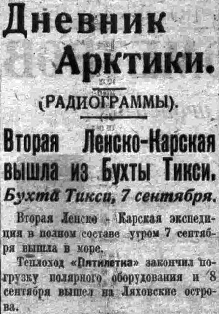 Теплоход «Пятилетка» стоит в бухте Тикси на погрузке полярного оборудования для Ляховских островов. «Пятилетка» предполагает выйти 7 сентября с полным составов зимовщиков, во главе с начальником полярной станция тов. Ляхом.