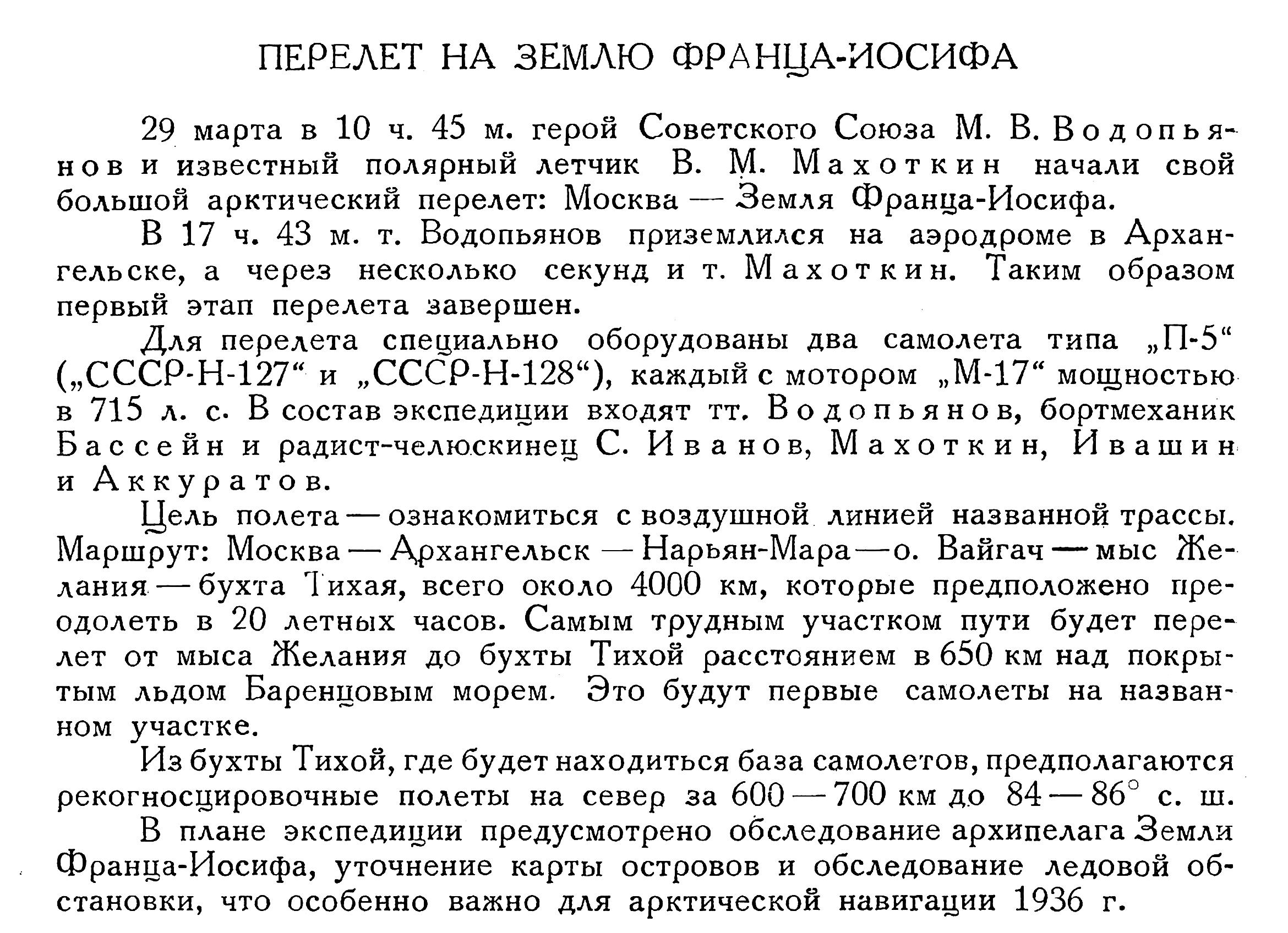 Замечательный перелет героя Советского Союза М. В. Водопьянова Москва — Земля Франца-Иосифа — Москва закончен. 1) Пройдено 9000 км в 75 летных часов, впервые в истории советские самолеты пересекли Баренцово море и достигли 83° сев. шир. — 700 км от полюса.