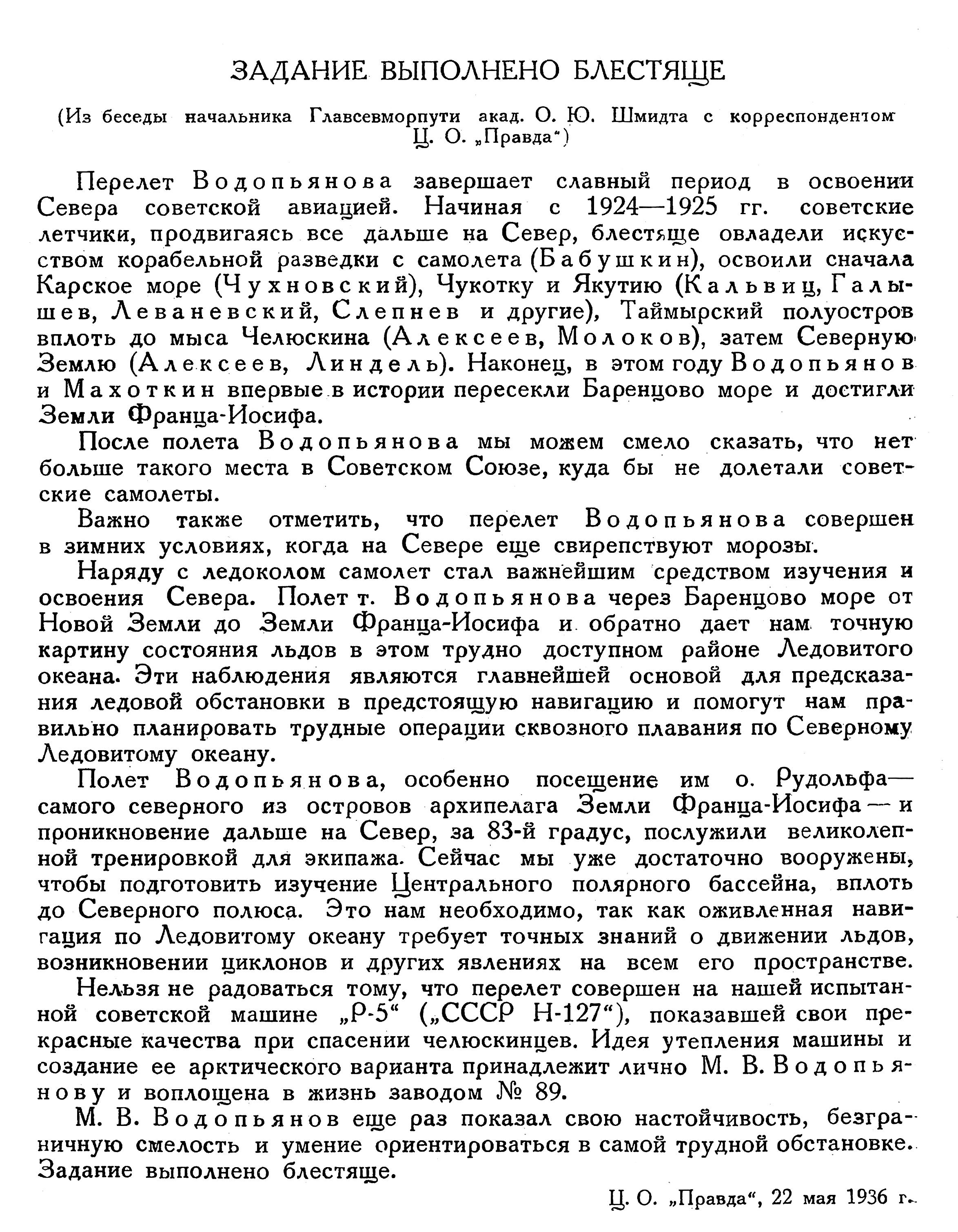 Нельзя не радоваться тому, что перелет совершен на нашей испытанной советской машине „Р-5“ („СССР Н-127"), показавшей свои прекрасные качества при спасении челюскинцев. Идея утепления машины и создание ее арктического варианта принадлежит лично М. В. Водопьянову и воплощена в жизнь заводом № 89.