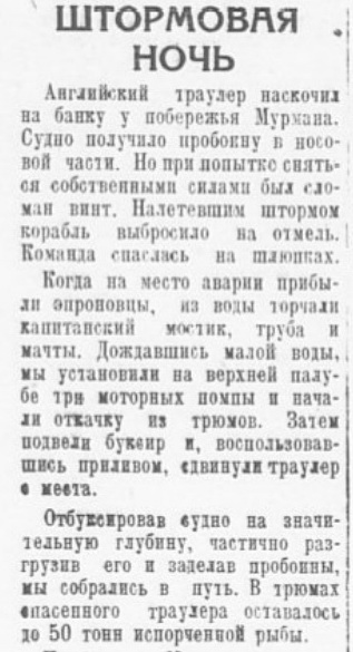 Ночью разыгрался шторм. Он был особенно страшен для судов стоявших у берега. К северо-западному берегу острова Диксон (около мыса Кречатник) была подведена баржа с оборудованием для новой радиостанции. Этот берег Диксона каменист и не защищен от ветров. Громадным валом баржу подняло и она оказалась на остром подводном камне. Оборудованию грозила гибель.