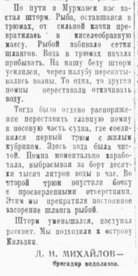 «Белоушатник» получил пробоину, водолазы быстро исправили повреждение. Баржа с углем для ледоколов села на подводную скалу. Водолазы наложили под водой пластырь и спасли уголь. Выручая суда водолазы часто находили выход из, казалось бы, безнадежного положения.