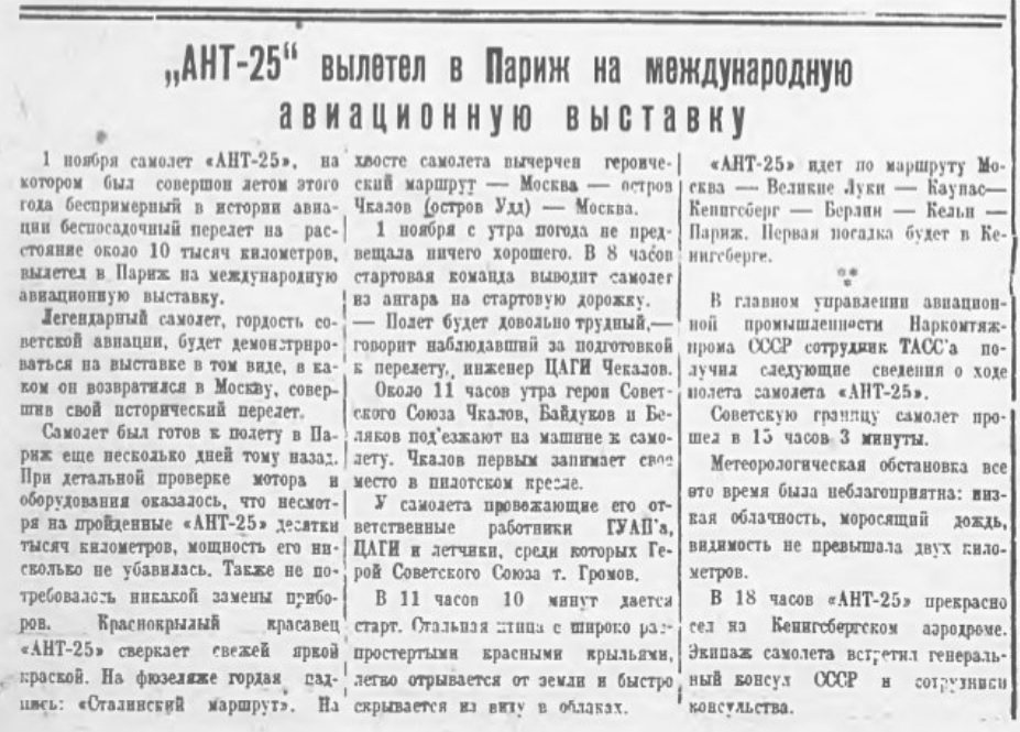 По неизученной трассе, в труднейших метеорологических условиях, советский самолет "АНТ-25", спроектированный и построенный силами Центрального Аэрогидродинамического института (ЦАГИ), под управлением первого пилота орденоносца