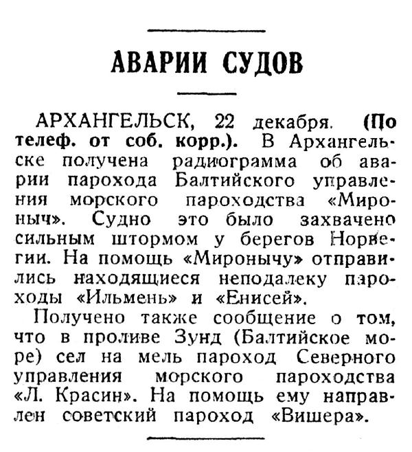 Пароход. Заложен 24.01.1925 г. на Балтийском заводе в Ленинграде, спущен на воду 25.10.1925 г. и 11.07.1927 г. включен в состав СГК Совторгфлота. С 28.01.1933 г. входил в состав БГК,с 15.03.1934 г .- в состав БГМП, с 01.01.1940 г. - в состав СГМП. В годы Великой Отечественной войны осуществлял народнохозяйственные перевозки в Баренцевом. Белом и Карском морях. В период с 25.11 по 05.12.1942 г. совершил самостоятельный переход с экспортным грузом из губы Белушья (острова Новая Земля) в Акурейри (Исландия), а оттуда через Панамский канал во Владивосток и 27.02.1943 г. переведен на баланс ДГМП. 06.02.1946 г. вновь вошел в состав СГМП. 07.03.1963 г. выведен из эксплуатации и исключен из списков судов ММФ.