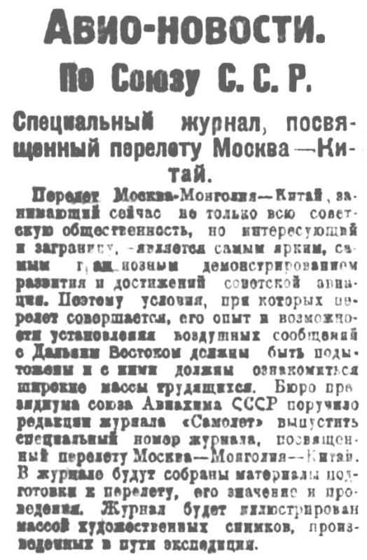 Перелет Москва — Монголия — Китай, занимающий сейчас не только всю советскую общественность, но интересующий и заграницу, является самым ярким, самым грандиозным демонстрированием развития и достижений советской авиации. Поэтому условия, при которых перелет совершается, его опыт в возможности установления воздушных сообщений с Дальним Востоком должны быть подытожены и с ними должны ознакомиться широкие массы трудящихся. Бюро президиума союза Авиахима СССР поручило редакции журнала «Самолет» выпустить специальный номер журнала, посвященный перелету Москва — Монголия — Китай. В журнале будут собрали материалы подготовки к перелету, его значение и проведение. Журнал будет иллюстрирован массой художественных снимков, произведённых в пути экспедиции.