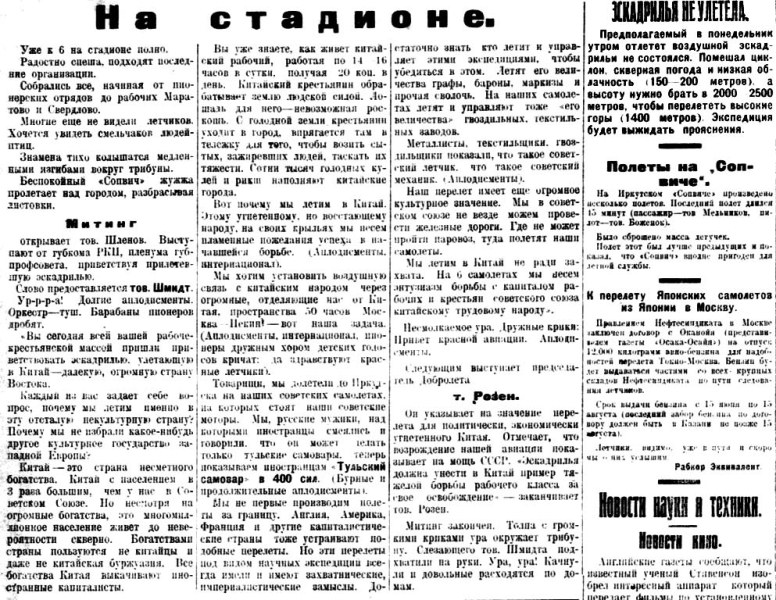 Он указывает на значение перелета для политически, экономически угнетенного Китая. Отмечает, что возрождение нашей авиации показывает на мощь CCCР. «Эскадрилья должна унести в Китай пример тяжелой борьбы рабочего класса за свое освобождение — заканчивает тов. Розен.