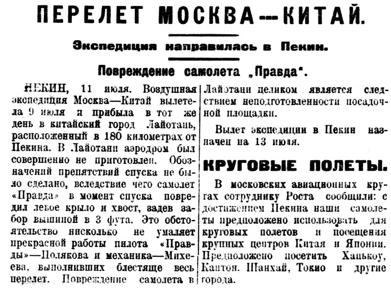 ПЕКИН, 11 июля. Воздушная экспедиция Москва — Китай вылетела 9 июля и прибыла в тот же день в китайский город Лайотань, расположенный в 180 километрах от Пекина. В Лайотани аэродром был совершенно не приготовлен. Обозначений препятствий спуска не было сделано, вследствие чего самолет «Правда» в момент спуска повредил левое крыло и хвост, задев забор вышиной в 3 фута. Это обстоятельство нисколько не умаляет прекрасной работы пилота «Правды» — Полякова и механика — Михеева, выполнивших блестяще весь перелет. Повреждение самолета в Лайотани целиком является следствием неподготовленности посадочной площадки.