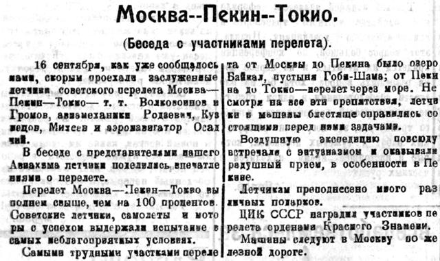 По данным, которые уже имеются у летчиков, им удалось быстрее пролететь путь Москва — Пекин — Токио, чем это было у японских летчиков, несмотря на то, что путь наших летчиков был значительно длиннее. Наша экспедиция пробыла в воздухе 68—69 часов, японская — 72 часа, всего в пути наши — 32 дня, японские — 36.