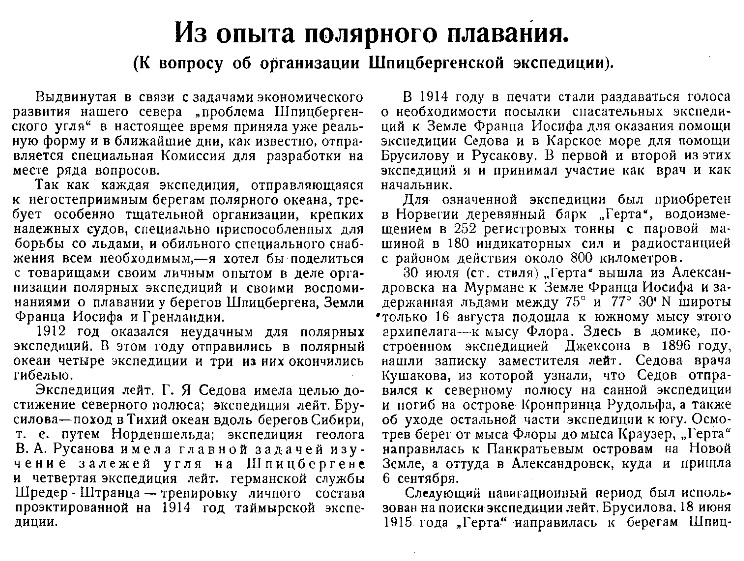Коган, Е.Е. Плавание экспедиционного судна "Герта" для поисков лейтенанта Брусилова и его спутников в 1915 г.