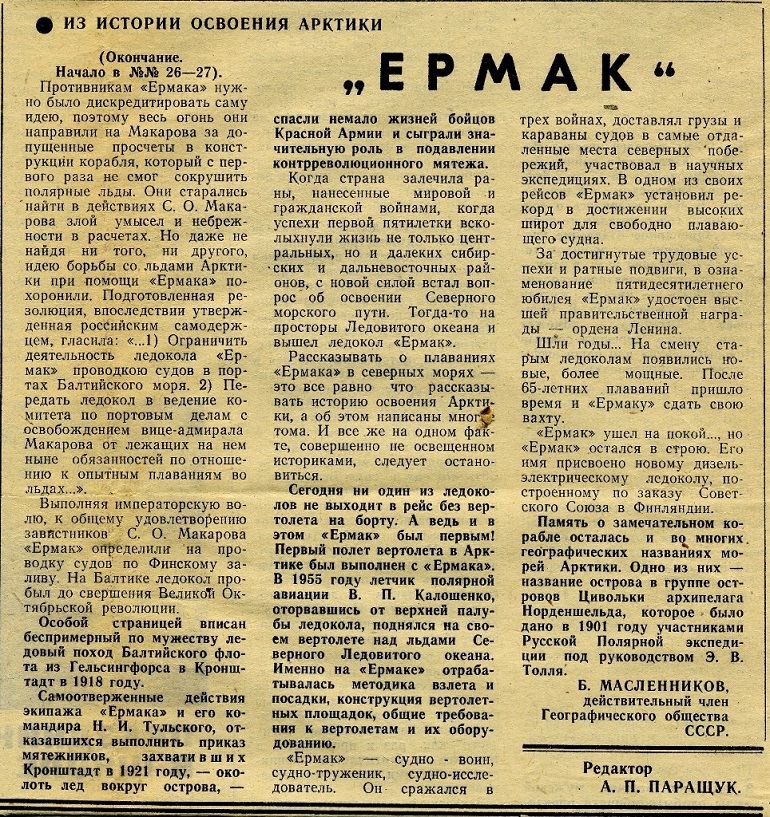 В одной из книжек лежала газета "Советский Таймыр" за 9 марта 1978г. В своё время сохранил её потому что в ней упоминался отец жены. Но когда сегодня начал по новому её просматривать, то нашёл сведения о первом применении вертолёта на л/к. Это был "Ермак".