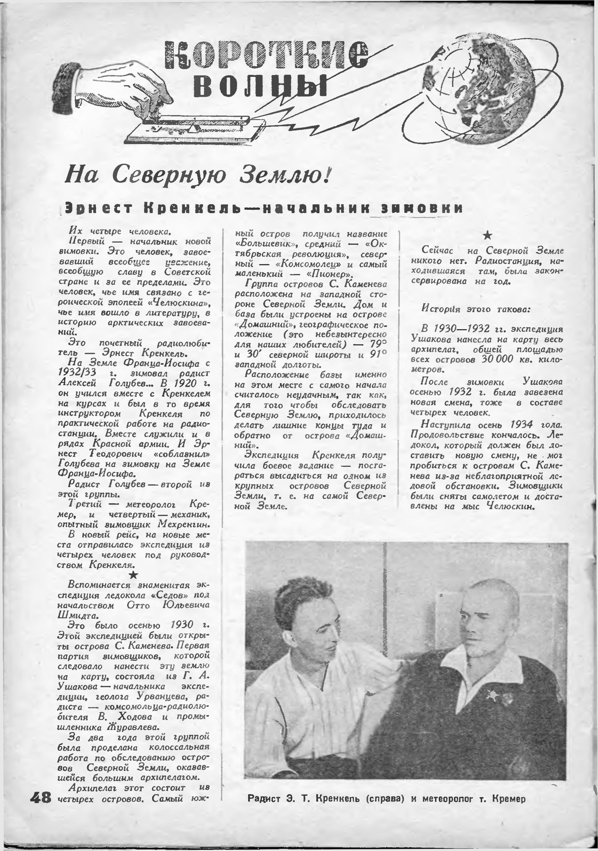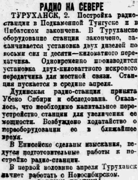 Группа зимовщиков под руководством КРЕНКЕЛЯ выехала из Архангельска на краснознаменном ледоколе «Сибиряков» в середине июля. Работу радиостанции предполагается начать во второй половине августа.
