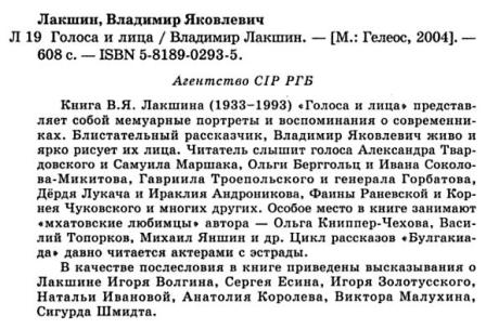 Лакшин, Владимир Яковлевич. Голоса и лица / Владимир Лакшин. — [М.: Гелеос, 2004]. — 608 с. — ISBN 5-8189-0293-5.