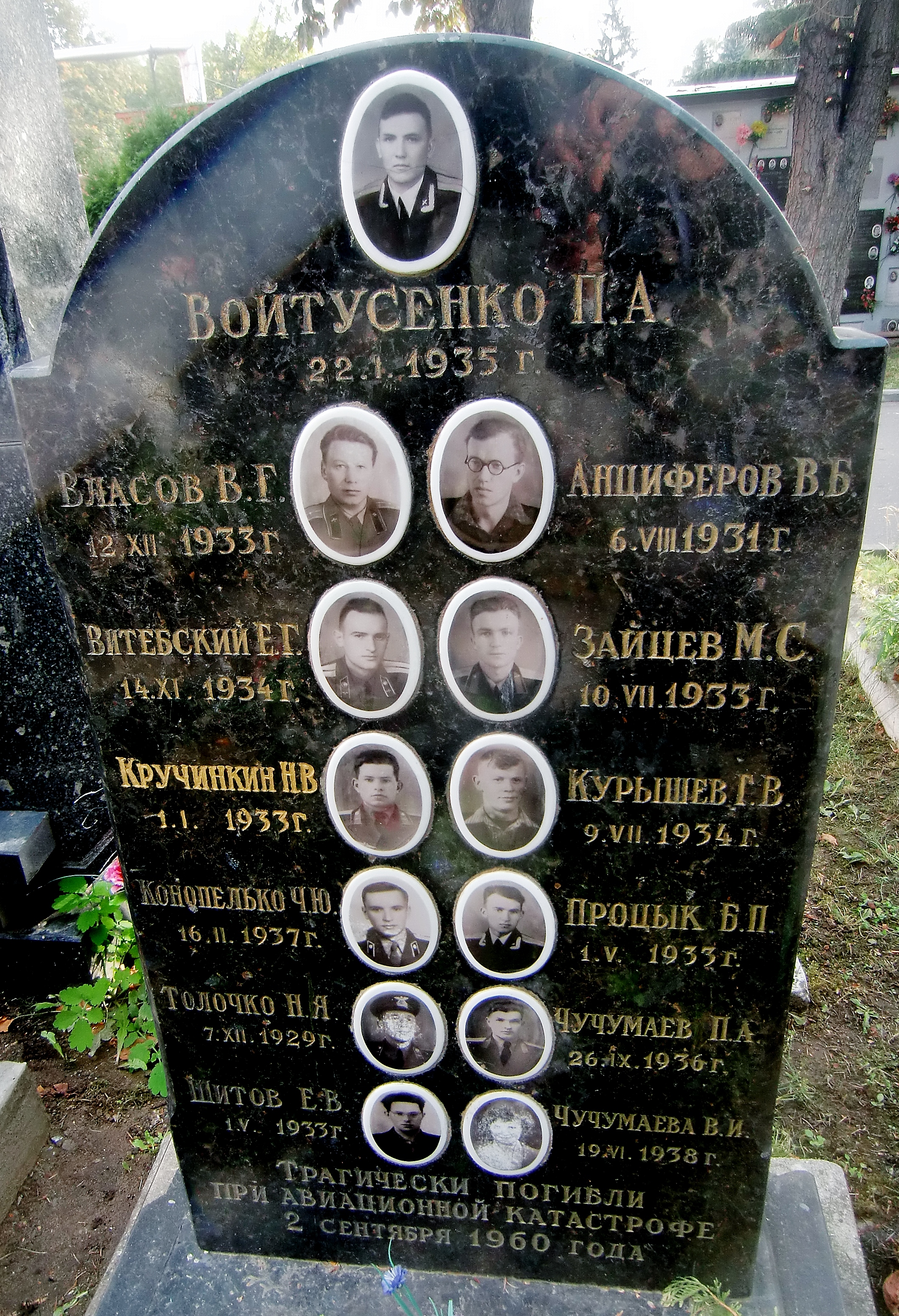 Экипаж самолета, останки которого обнаружились у Зихнова, состоял из пяти человек. На борту было 13 пассажиров, в том числе одна женщина. В Архиве народного хозяйства мы нашли полный список погибших - Н.Д. Поляков, О.М. Козлов, Ю.А. Румянцев, Н.В. Самарин, А.А. Тарарухин. Это авиаторы. Электромонтер Г.В. Курышев из Москвы, Ч.Ю. Конопелько из Гродненской области, В.Г. Власов из Курской, П.А. Чучумаев из Уральска, Б.П. Процык из Львовской области, Н.Я. Толочко из Черниговской, Н.В. Крутинкин из Мордовской АССР, М.С. Зайцев из Орловской области, Е.Г. Визевский из Харькова, П.А. Войтусенко из Ставрополя. Все они - военнослужащие. Е.В. Шитов из Москвы, В.Б. Анцифирев из Свердловска, В.И. Чучумаева из Уральска.