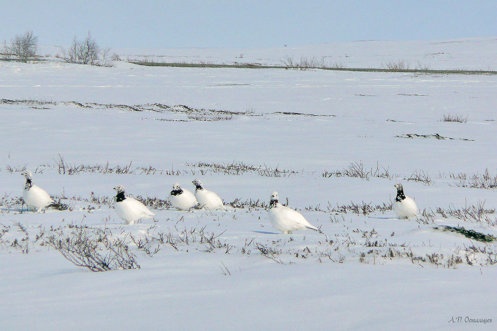 Белые куропатки, гнездящиеся в тундрах полуостровов Ямала, Гыдана и Тазовского зимуют как здесь, так и южнее — в лесотундре или северной тайге. Было установлено, что чем ниже средненоябрьские температуры в тундре, тем больше птиц летит на зимовку в лесотундру, причем критической является температура —20°С…—25°С. Снег не является здесь решающим фактором, поскольку зима сравнительно малоснежна, и в течение зимних месяцев происходит скорее перевевание снега, чем его накопление (Назаров. Шубникова, 1971). Даже в середине зимы значительные массивы кустарников на Ямале и Гыдане остаются открытыми (Сдобников, 1957), и зимующие куропатки наблюдаются в самых северных частях Гыдана, под 72°30' с. ш. (Назаров, Шубникова, 1971). Но большая часть птиц все же откочевывает отсюда южнее. Из тундр Ямала они прилетают на зимовку в лесотундру между Уралом и Обью, проникая по долине последней к югу до 64° с. ш. Птицы с Тазовского и Гыданского полуостровов зимуют в области устья р. Надым, в лесотундре между Надымом и Пуром, по долинам Пура и Таза, в низовьях р. Мессо-Яха (Назаров, Шубникова, 1971) Таймырские куропатки также зимуют в полосе лесотундры и в долинах ряда северотаежных рек, но основная их масса концентрируется в долине нижнего Енисея, от устья до Туруханска (Павлов, 1975). Весенний пролет длится на Таймыре до 2.5 мес., он приурочен к массовой миграции северных оленей в мае—начале июня. Многочисленные стаи белых куропаток сопровождают стада оленей, двигающиеся на северо-запад, расхаживая под ногами кормящихся животных (Кречмар, 1966) В Ленско-Хатангском междуречье отлет белых куропаток в лесотундру происходит уже в сентябре. В дельте Лены отлет основной массы птиц наблюдался в ноябре, когда снег сильно уплотнился и начались снежные метели; окончание ответа здесь определялось временем наступления полярной ночи во вторим половине этого месяца. Весенний прилет в дельту Лены происходил с 11 апреля и до конца этого месяца (Романов. 1934). В междуречье Лены и Колымы наблюдается такая же картина. Особенно интенсивный осенний пролет наблюдался в долине р. Чукочьей, где птицы двигались в стаях по 250 300 особей (Перфильев, 1975). На обширных пространствах Северо-Восюка СССР. где горные тундры чередуются с редколесьями долин, четко выраженных миграций с направлением “север — юг” нет. Белые куропатки всю зиму кочуют здесь без какого-либо определенного маршрута, стихийно скапливаясь в местах, богатых кормом.