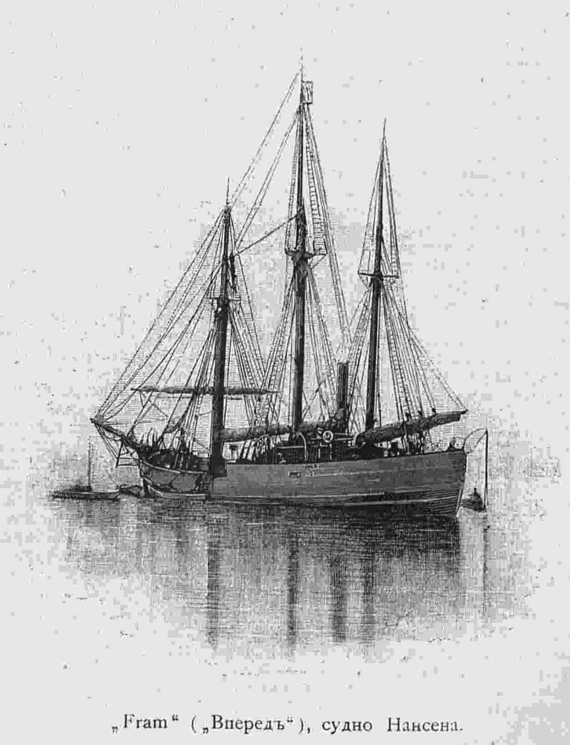 Напомним пока, в общих чертах, в чем состоял план Нансена и как снаряжена была его экспедиция. Нансен отплыл из Христиании 12-го июня 1893 года. Для экспедиции его было выстроено особое судно, которому было дано название «Вперед» (Fram). По типу — это трехмачтовая паровая шкуна, но с совершенно особым устройством кузова. Главная опасность, угрожающая судну в полярных морях, — это, без сомнения, лед. Судно, попавшее между двух льдин, из которых каждая может быть весом в несколько миллионов или миллиардов пудов, будет неминуемо раздавлено, из какой бы прочной и толстой стали ни было оно сооружено. Единственное мыслимое предупредительное средство против такой катастрофы (угрожающей на каждом шагу) — это придание кузову судна, его подводной части, такого очертания, чтобы лед не мог захватить и сдавить его, чтобы оно выскользнуло из этих смертных тисков, было выперто льдом кверху. Вот именно на такое выпирание при сжатии с боков и рассчитана была круглая подводная часть «Фрама». Это судно, при сжатии между двух масс льда не может быть раздавлено, а будет приподнято, сядет на поверхности льда. Таким путем была, если не вполне, то в значительной части, устранена главная опасность путешествия — гибель от затирания льдами. Другая гроза этих путешествий — истощение припасов, голод. Нансен предупредил эту беду, захватив с собою всяких припасов на четыре года.