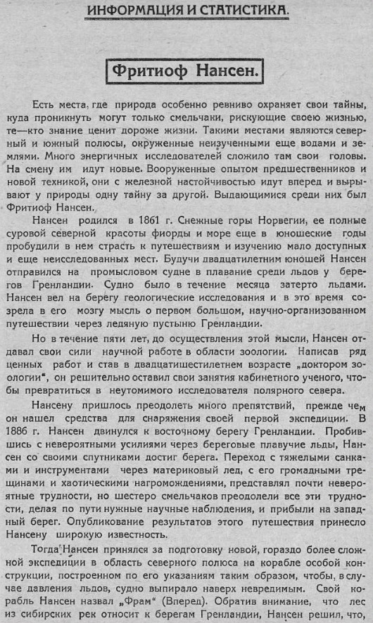 Фритиоф Нансен теперь пребывает в Англии. Его встреча там была настоящим триумфом, выдающимся событием последнего времени. Ученые общества наперерыв приглашали его делать в их заседаниях сообщения о его путешествии. Королевское географическое общество выдало ему за такое сообщение весьма крупный гонорар. Нансен — мужчина в цвете лет — ему идет всего лишь тридцать седьмой год. Девятнадцатилетним юношей поступил он в Христианийский университет, в Норвегии, имея в виду научно подготовиться к деятельности зоолога-путешественника. В 1882 г. он впервые посетил Северный Ледовитый океан, был на Шпицбергене, потом в Исландии и Гренландии. По возвращении из этого путешествия он принял место куратора в музее естественной истории в Бергене. В 1888 г. он сдал испытание на доктора философии, и после того совершил свою известную экскурсию через Гренландию. После того он вновь был куратором, на этот раз в музее сравнительной анатомии при университете в Христиании. Когда норвежское правительство задумало снарядить экспедицию к северному полюсу выбор руководителя этой экспедиции сам собою падал на Нансена, уже обладавшего опытом своих прежних странствий по северу. В 1892 г. он выработал проект своего судна «Fram», предназначенного для этой экспедиции, и в 1893 г. пустился на нем в свое последнее знаменитое путешествие. Доктор Нансен женат и имеет маленькую дочь. Английские иллюстрированные издания полны портретами знаменитого путешественника, где он представлен один, с женою, с дочерью, в кругу своих спутников и т. д.