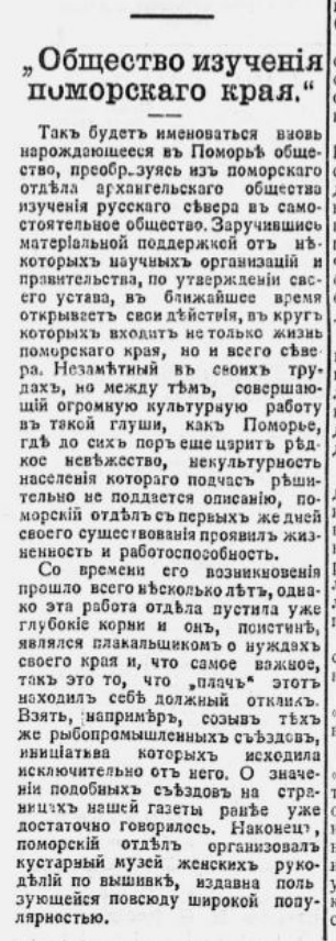 Это общество просуществовало с 1908 по 1917 год и внесло большой вклад в изучение Русского Севера. …В конце XIX - начале ХХ века началось активное изучение, заселение и освоение природных ресурсов Русского Севера. Усилиями архангельских губернаторов А.П.Энгельгардта и