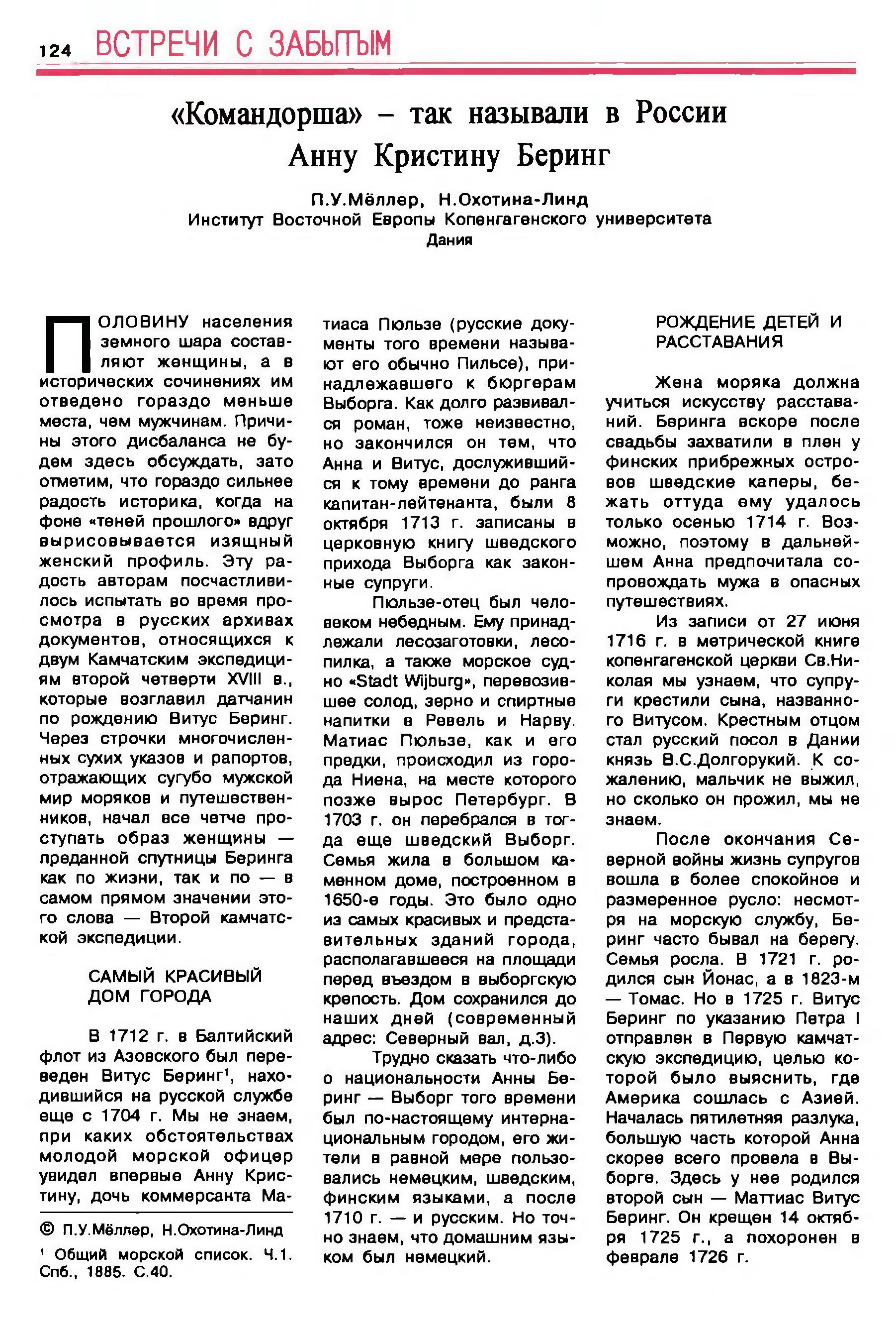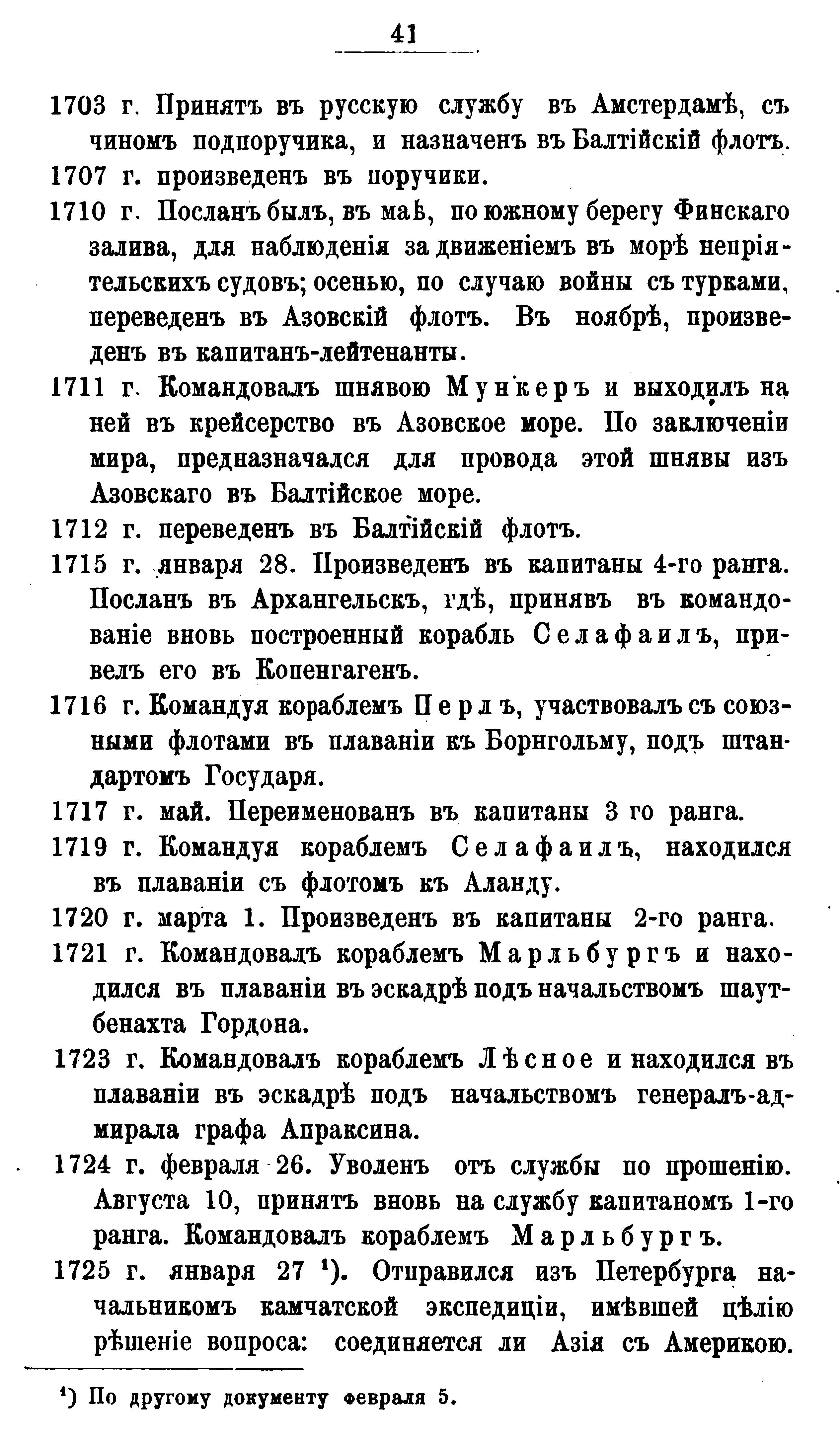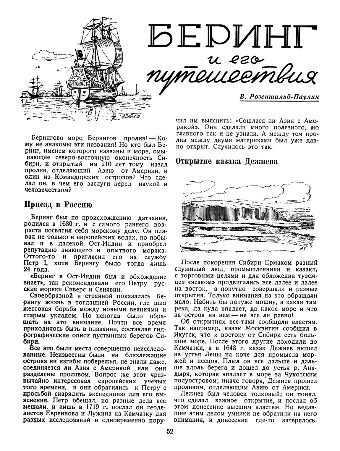 (или Иван Иванович, как его звали на Руси) — капитан-командор, первый русский мореплаватель, именем которого названы пролив, отделяющий Азию от Америки (хотя первый посетил его в 1648 г. казак Дежнев). Первый исследовал сев. берега Камчатки, вост. часть Азии, о. Св. Лаврентия, о. Св. Диомида; первый из всех европейских мореплавателей посетил моря Камчатское и Бобровское, названное впоследствии Беринговым, и открыл цепь о-вов Алеутских, о-ва Шумагинские, Туманные, сев.-западную часть Америки и бухту Св. Илии. — Б. родился в 1680 г. в Ютландии, в русскую морскую службу вступил в 1704 г., с чином унтер-лейтенанта. Приглашая его, Петр основывался на представлениях о нем Сиверса и Сенявина, заявлявших, что он "в Ост-Индии был и обхождение знает". По свидетельству Миллера, в 1707 г. Б. был лейтенантом, а в 1710 г. — капитан-лейтенантом. Неизвестно только, в каких морях он плавал в это время и сам ли командовал судами или находился под командой. 1714—16 гг. Б. провел все почти время на море, побывал и в Копенгагене, и в Архангельске. С 1716 г. по 1723 сведений о жизни Б. нет. Под 1723 г. в журналах адмиралтейств-коллегии находится постановление об отставке Б., которую он просил, не добившись желаемого им чина капитана первого ранга. Но в следующем году император отдает приказание коллегии пригласить снова на службу Б. и дать ему чин капитана 1-го ранга. С этого (1724) года Б. неизменно служил русскому флоту до самой смерти и всю свою деятельность посвятил решению вопроса, поставленного ему великим преобразователем: "соединяется или нет Азия с Америкой". С этим вопросом и просьбой снарядить экспедицию впервые обратились к Петру голландские ученые во время его пребывания в Голландии, в 1717 г. ту же просьбу к Петру повторила и Парижская академия наук. Отзывчивый преобразователь сочувственно отнесся к их просьбе, но политические события заставили его отложить выполнение этого дела до 1725 года. 23 декабря 1724 г. он собственноручно написал следующую инструкцию для начальника экспедиции Витуса Беринга: 1) надлежит на Камчатке или в другом там месте сделать один или два бота с палубами, 2) на оных ботах возле земли, которая идет на Норд и по чаянию (понеже оной конца не знают), кажется та земля часть Америка, 3) для того искать, где оная сошлась с Америкой: и чтоб доехать до какого города европейских владений или ежели увидят какой корабль европейской проведать от него, как оный кусть называют и взять на письме и самим побывать на берегу и взять подлинную ведомость и поставя на карту приезжать сюды".