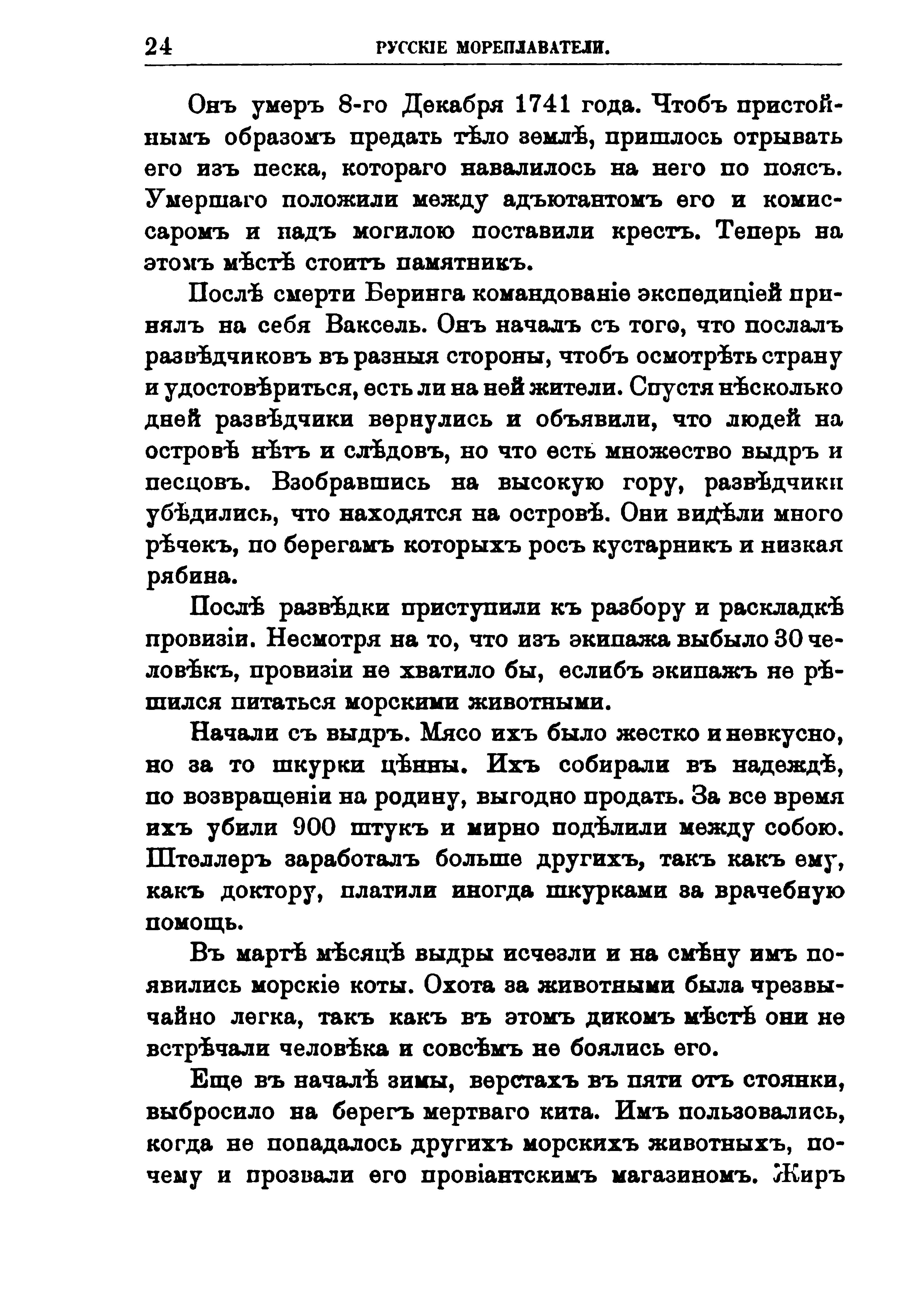 Оставшиеся в живых спутники Б. почтили своего командора, как могли: вынули его тело из ямы, в которой он стоял, по пояс заваленный песком от холода, предали земле и над могилой поставили деревянный крест, замененный в 1822 г. памятником; в 1866 г. был ему поставлен другой памятник, в Петропавловске. Так окончил свою жизнь первый русский мореплаватель. Витус Б., человек довольно образованный по тому времени, набожный, всеми любимый за свою "кротость и смирение", но весьма неэнергичный и несмелый путешественник, который, по словам Штеллера, его спутника, был более способен "с примерной ревностью и усердием исполнять поручения начальства" и "нередко сам признавался, что вторая Камчатская экспедиция свыше сил его". Скажем еще несколько слов о дальнейшей судьбе спутников Б. Питаясь мясом морских животных (бобров, морских котов и др.), они прожили здесь до августа следующего года (1742). Наконец решили из остатков разбитого корабля построить новый и на нем в начале августа выехали в море. 25 числа этого месяца они увидели берег Камчатки, а 27 бросили якорь в Петропавловском порте. В 1743 г. они прибыли на своем судне в Охотск, отсюда направились в Петербург, которого достигли далеко не все выступившие из Охотска. Последними вернулись в Петербург Чириков (1747) и Уессель (1749). Несмотря на многочисленные трудности, по большей части непреодолимые по тогдашним средствам, эта экспедиция значительно расширила географ. сведения о берегах Ледовитого океана, низовьях больших сибирских рек, познакомила также с этнографическими особенностями обитателей Сибири и показала возможность плавания по Ледовитому океану вдоль берегов в течение летнего времени. Ср. "Заслуги Петра В. по части распространения географических познаний" (Зап. Имп. русск. геогр. общ.", т. III); В. Н. Берх, "Первое морское путешествие Россиян"; его же, "Жизнеописание Беринга" ("Русский архив", 1823 год, кн. VI); Соколов, "Беринг и Чириков" ("Сев. пчела", 1849 г., № 98—99); "Первая камчатская экспедиция" ("Зап. Гидрограф. департамента", т. VIII и "Отеч. зап.", 1851 г., 3); ст. Стренцеля, "Русские экспедиции" ("Кронштадтский вестник", 1876 г., 78—127); Вахтин, "Первые труженики моря" (СПб., 1890).