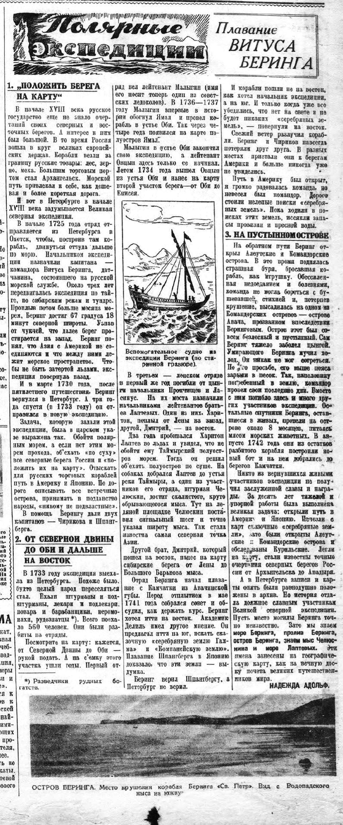Другой отряд, которому было назначено проплыть от у. р. Оби до Чукотского Носа, находился под начальством лейтенанта Овцына. Но последнего как-то постоянно заставала зима в момент отплытия, и в течение всех трех годов (1735—1737 г.) ему только в последний год удалось вверх по Оби добраться до 72° 30' с. ш. Из других участников этого отряда, выступавших для самостоятельных исследований, следует указать на лейтенанта Прончищева, которому удалось добраться до у. Таймыра (1736 г.), Лассениуса, погибшего вместе с значительной частью своего отряда в Харудах, между Яной и Индигиркой (1735 г.), и лейтенанта Лаптева, имеющего едва ли не более всех участников (после Чирикова) Второй камчатской экспедиции прав на память о нем, как о энергичном, деятельном и счастливом путешественнике. После неудачной попытки в 1736 г. пробраться из Якутска в Камчатку, что имел в виду и Лассениус, Лаптев по предписанию сената в 1739 г. 29 июня вышел из Лены и в конце августа достиг у. Индигирки, зимовал здесь и с наступлением лета поплыл вдоль берегов до Колыми, откуда в 1740 г. пришел пешком через Анадырский острог в Якутск. Наконец, выполнение, так сказать, третьей задачи — проплыть морем в Америку — легло на самого Беринга. Он выступил из Петербурга в начале 1733 г., но за дальностью пути, медленностью в перевозке множества припасов и, наконец, вследствие препятствий, встреченных в Охотске при строении четырех мореходных судов, мог выйти в море из Охотска только в сентябре 1740 года. Придя в Петропавловскую гавань, он остался здесь зимовать. 4 июня 1741 г. вышел Б. в море на двух судах: "Петр" и "Павел", из которых одним командовал Чириков. На предварительном совете решено было держаться юго-вост. направления до тех пор, пока не встретят земли. Но, не встретив ее и под 50° ш., они поворачивают прямо на В. Вскоре их разлучает буря, и они продолжают плыть отдельно, не увидевшись уже более никогда. В этом восточном направлении Чирикову первому посчастливилось встретить землю — 15 июля под 56°, а Берингу — 18 июля, под 58° 28' с. ш. После того, как посланные на берег люди не вернулись, а другой высадки за недостатком гребных судов сделать нельзя было, Чириков повернул обратно к Камчатке. Беринг между тем открывает бухту Св. Илии, представляющую совершенно безопасную гавань, соседние с неизвестным ему материком острова, крейсирует недалеко от берегов на неизвестном море в течение сентября и октября, когда свирепствовала сильная буря, и наконец решается идти в обратный путь, в Камчатку. Этот обратный путь стоил жизни многим членам экспедиции и самому командиру. Страшная буря и ветхость судна и снастей сделали его игрушкой ветра, а недостаток в съестных припасах, пресной воде, болезни и холод лишили возможности плавающих не только бороться с ветром, но исполнять самое необходимое на корабле. В таком беспомощном состоянии он был сначала прибит к подводной скале, а затем нахлынувшая волна перебросила судно через риф на тихое место, где на 4 ½ саженях глубины и в 300 с. от берега опустили якорь на песчаное дно. Это был остров Авача, который теперь называется Беринговым. Он расположен в 185 км от Камчатки, под 55° 17' с. ш. и 165° 46' з. д. (от Гринвича), принадлежит к береговой области Сибири, пространством около 1600 кв. км, безлесен и неплодороден, но богат пушными зверями. Он со всех сторон окружен подводными камнями и только в одн