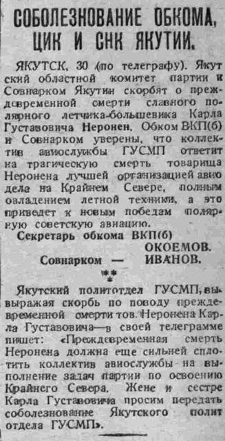 ЯКУТСК, 30 (по телеграфу). Якутский областной комитет партии и Совнарком Якутии скорбят о преждевременной смерти славного полярного летчика-большевика Карла Густавовича Неронен. Обком ВКП(б) и Совнарком уверены, что коллектив авиослужбы ГУСМП ответит на трагическую смерть товарища Неронена лучшей организацией авиодела на Крайнем Севере, полным овладением летной техники, а это приведет к новым победам полярную советскую авиацию.