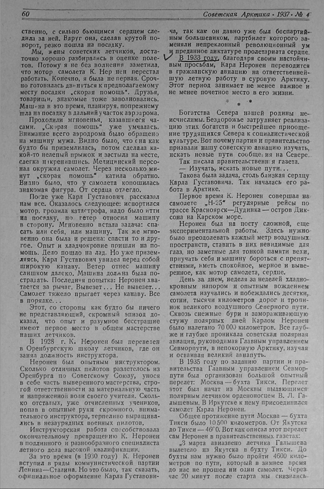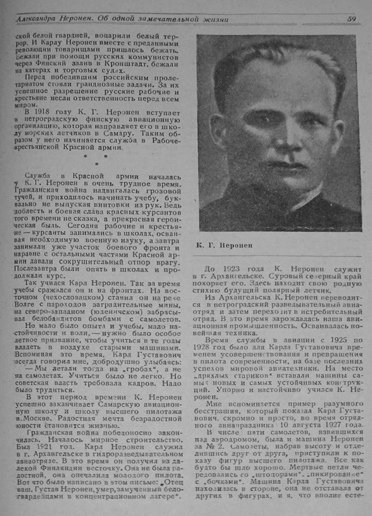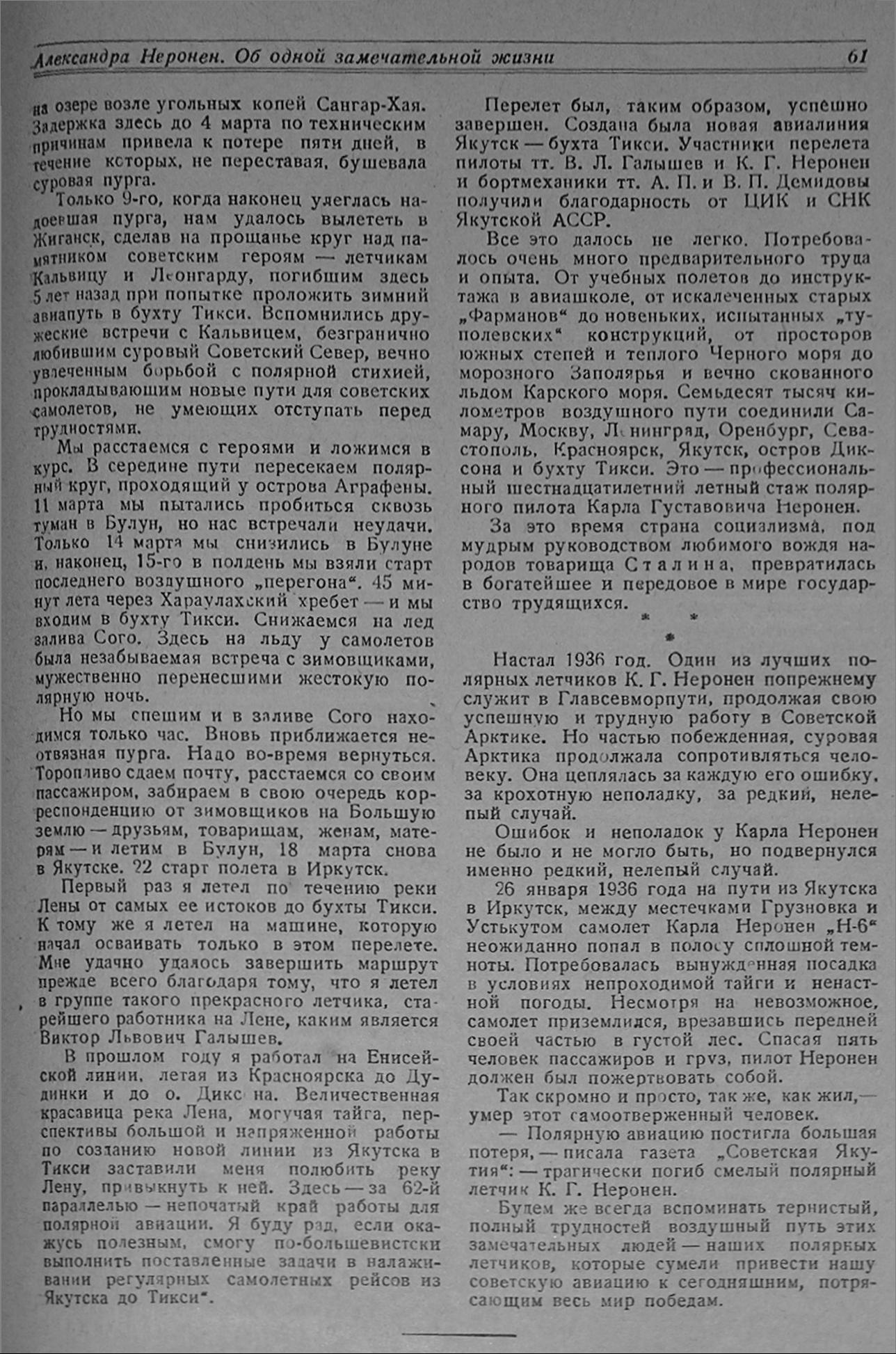 — Полярную авиацию постигла большая потеря, — писала газета „Советская Якутия": — трагически погиб смелый полярный летчик К. Г. Неронен.
