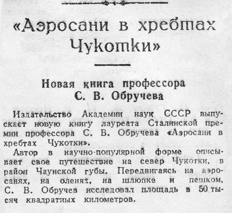 Издательство Академии наук СССР выпускает новую книгу лауреата Сталинской премии профессора С. В. Обручева «Аэросани в хребтах Чукотки».