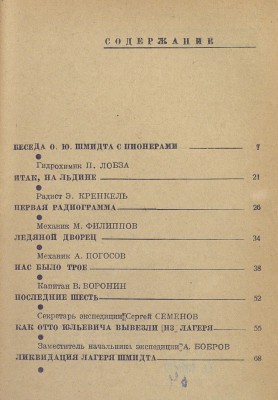В сборник включен, наряду с беседой, проведенной О. Ю. Шмидтом с киевскими пионерами,ряд очерков и воспоминаний челюскинцев.