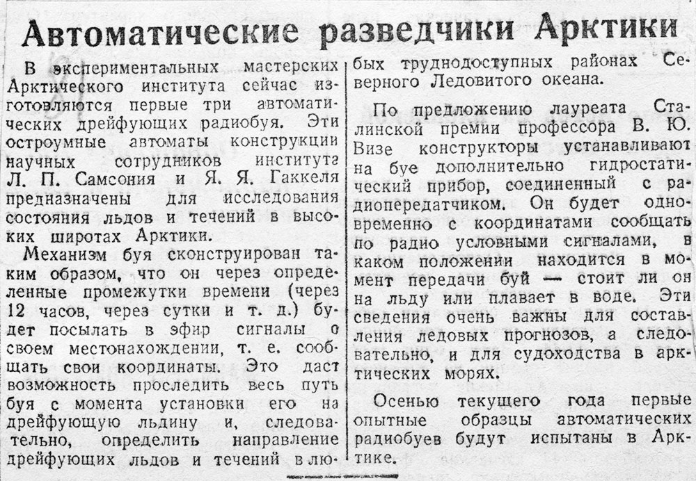 По предложению лауреата Сталинской премии профессора В. Ю. Визе конструкторы устанавливают на буе дополнительно гидростатический прибор, соединенный с радиопередатчиком. Он будет одновременно с координатами сообщать по радио условными сигналами, в каком положении находится в момент передачи буй — стоит ли он на льду или плавает в воде. Эти сведения очень важны для составления ледовых прогнозов, а следовательно, и для судоходства в аркитических морях.
